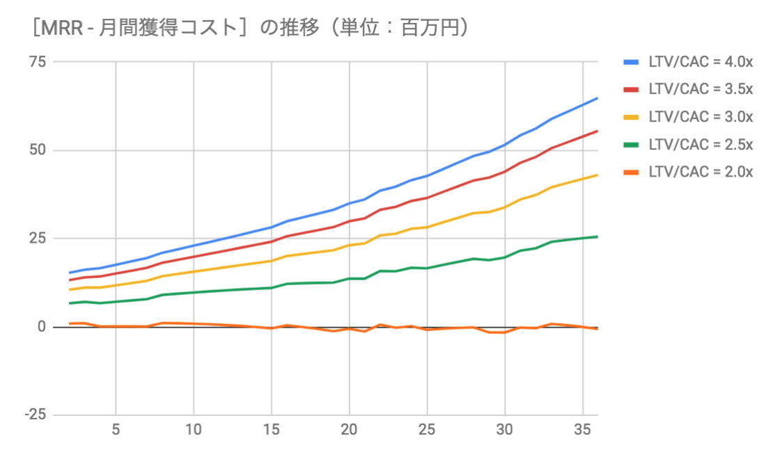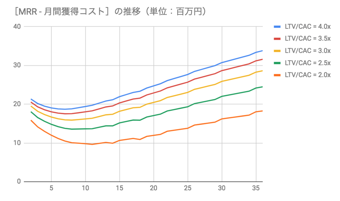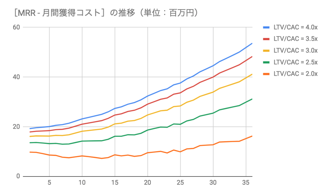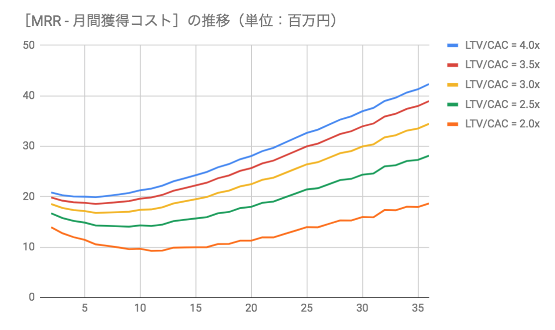 以下のグラフを見ると、LTV/CACの水準によって大きな差が出ることがよく分かります。LTV/CACが2倍だと、3年かけても「MRR - 月間獲得コスト」がなかなか最初の水準を超えませんでした。