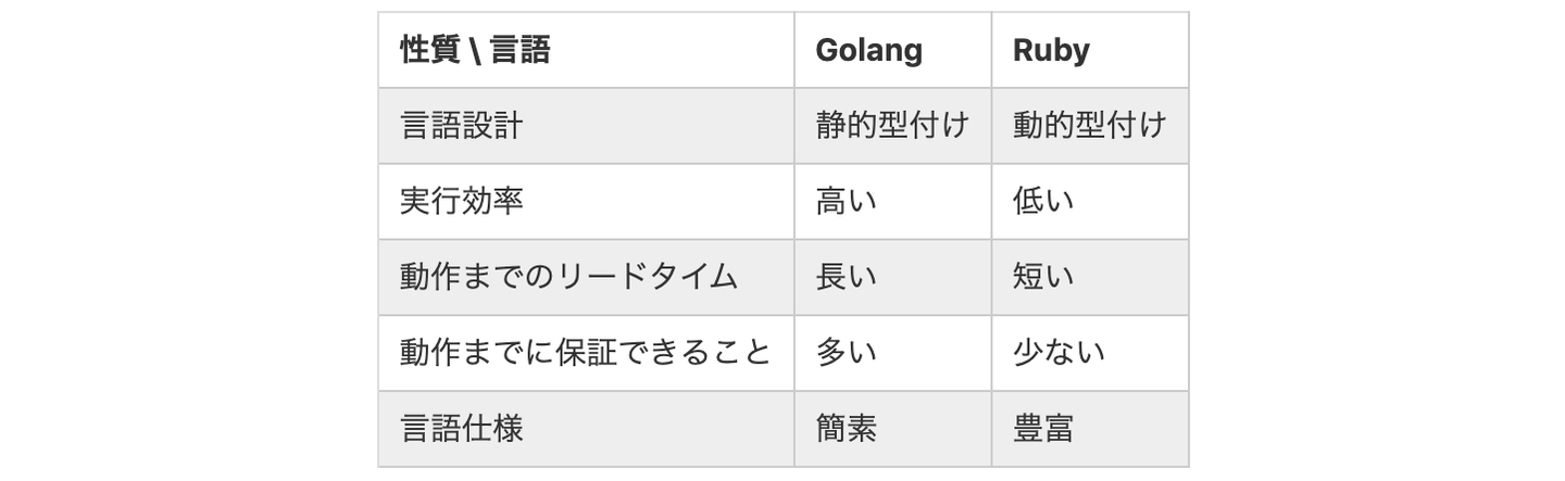 ここまで、Ruby と Go を「言語」「用途」「フレームワーク」の三つの観点から比較しました。もちろん、全ての点に置いて相性の良い性質を備えているわけではないですが、あるプログラミング言語や既成のフレームワークといった技術と、異なるユースケースを整理した上で、技術の採用やフレームワークの作成といったことを行うようにしています。それによって、全体として価値を最大化することを意図しています。一つの考え方として技術選定の参考になれば幸いです。