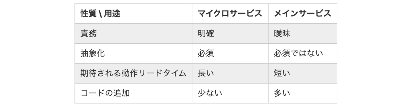 マイクロサービス、つまり責務が明確で少数のインターフェイスを持つサーバーに適切なフレームワークはどのようなものでしょうか。例えば、Rails で言えば ActionMailer のようなメールを送る機構は備えるべきでしょうか?あるいは ActiveRecord のような、リレーショナル・データベースを上手く操作するような、かつモデルと特定のユースケースを密結合させたようなライブラリを同梱するべきでしょうか?この例で言えばどちらも No になります。もう一度、メインサービスと比較した時のマイクロサービスの性質を載せます。