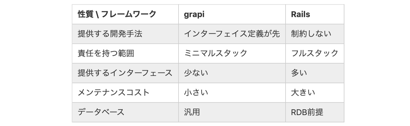 このような設計は既存の技術に対して相対的なものであり、技術的なポジショニングであると言えます。つまり grapi は Rails に対して、ミニマルスタック、インターフェイス少なめであるように設計することで価値を上げている、と言えます。
