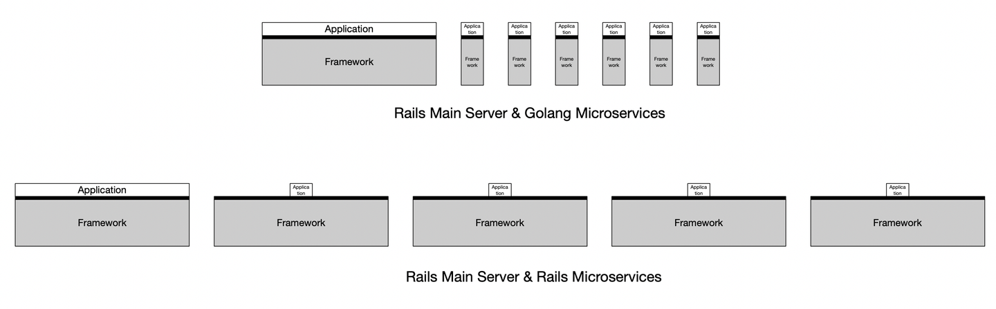 もう一つは、Go の Ruby の設計思想の違いと、そこから導かれるフレームワーク特性の違いという話があります。Go はミニマルであることを志向している言語です。そこで、Go でフレームワークを作るとしても抽象化の層は薄く剥がしやすいものとなりますし、使うかわからないような機能がデフォルトで入るというようなことはないでしょう(実際にこのような Go にフィットしたフレームワークとして Wantedly では grapi というものを開発しました、これは次節で話題にします)。一方、Ruby は開発者の楽しさを重視する言語であり、哲学はありますがミニマル志向ではありません。Ruby で支持されている Rails もまた非常に多くの API を提供しますし、HTMLの記述からメールの送信までも行うフルスタックのフレームワークです。なので Rails サーバー一つでアプリケーションを丸ごと作ることができます。こういった特性を持つ Rails だからこそサービス開発に使われてきたわけですが、これはマイクロサービス・アーキテクチャでは諸刃の剣の面があります。まず、よく出来たマイクロサービスは単一の責務を負うもので、マイクロサービス・アーキテクチャはそのようなソフトウェア・コンポーネントの集合からシステムを構成することが必要です。その観点で見ると、Rails というのは何でも簡単に出来すぎてしまいます。端的に言えば「とりあえずここに入れておこう」というのが簡単なのですね(ただ先ほど述べたように、とりあえず入れておけるデフォルトの開発場所を作る、と言うのは一つの妥当な選択です。つまり、例外的にこれはメインサーバーとしては良い性質であることにも注意が必要です)。そして、その簡単にするためのコードは Rails という巨大なソフトウェアに同梱されているため、Rails のバージョンアップなどのメンテナンスコストも大きくなりがちです。Go はこの逆ですね。下図は Go と Rails を組み合わせた場合と、Rails だけでマイクロサービスも作った場合の両方を、インターフェイスの規模感とアプリケーションコードの量と言う観点で示しています。[^2]