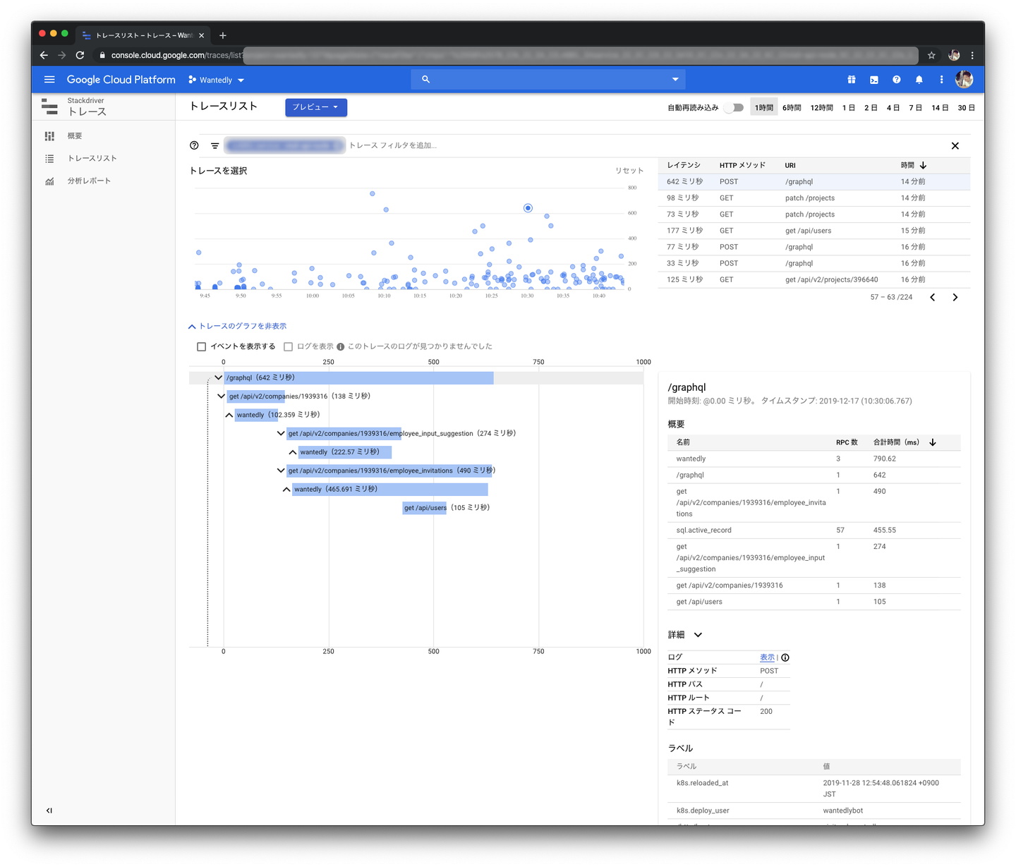 このように Wantedly では GraphQL を導入した BFF サーバの分散トレーシングを実現しています。この結果 Stackdriver では次のようにリクエストが可視化されるようになりました。