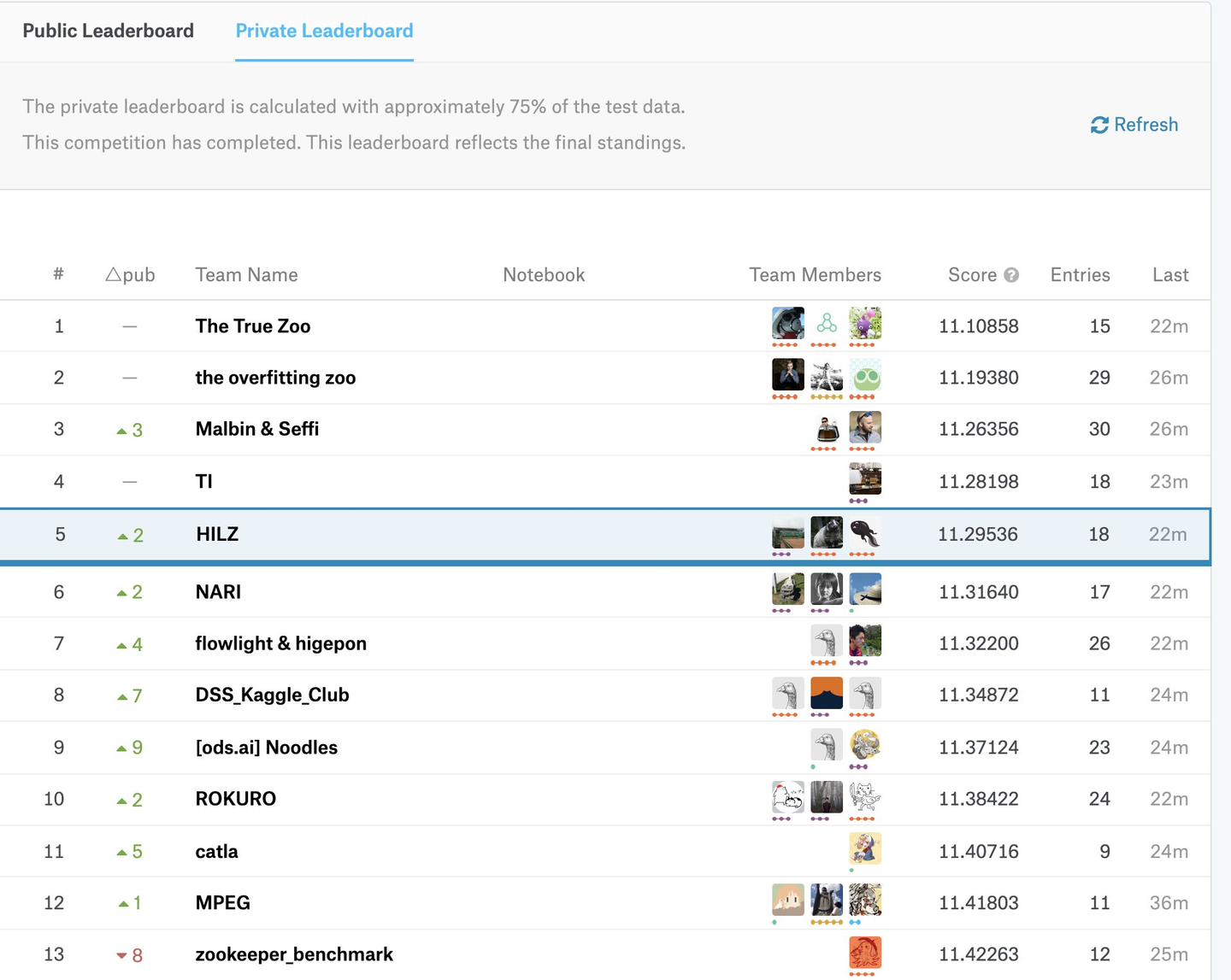 最終的には, 自分のモデルとチームメイトのモデルの加重平均を取ったものを最終サブミットに選択しました. やれることは大方やり, チームメイトみんなで力を出し切ったのですが, 結果は88チーム中5位という結果に終わりました.