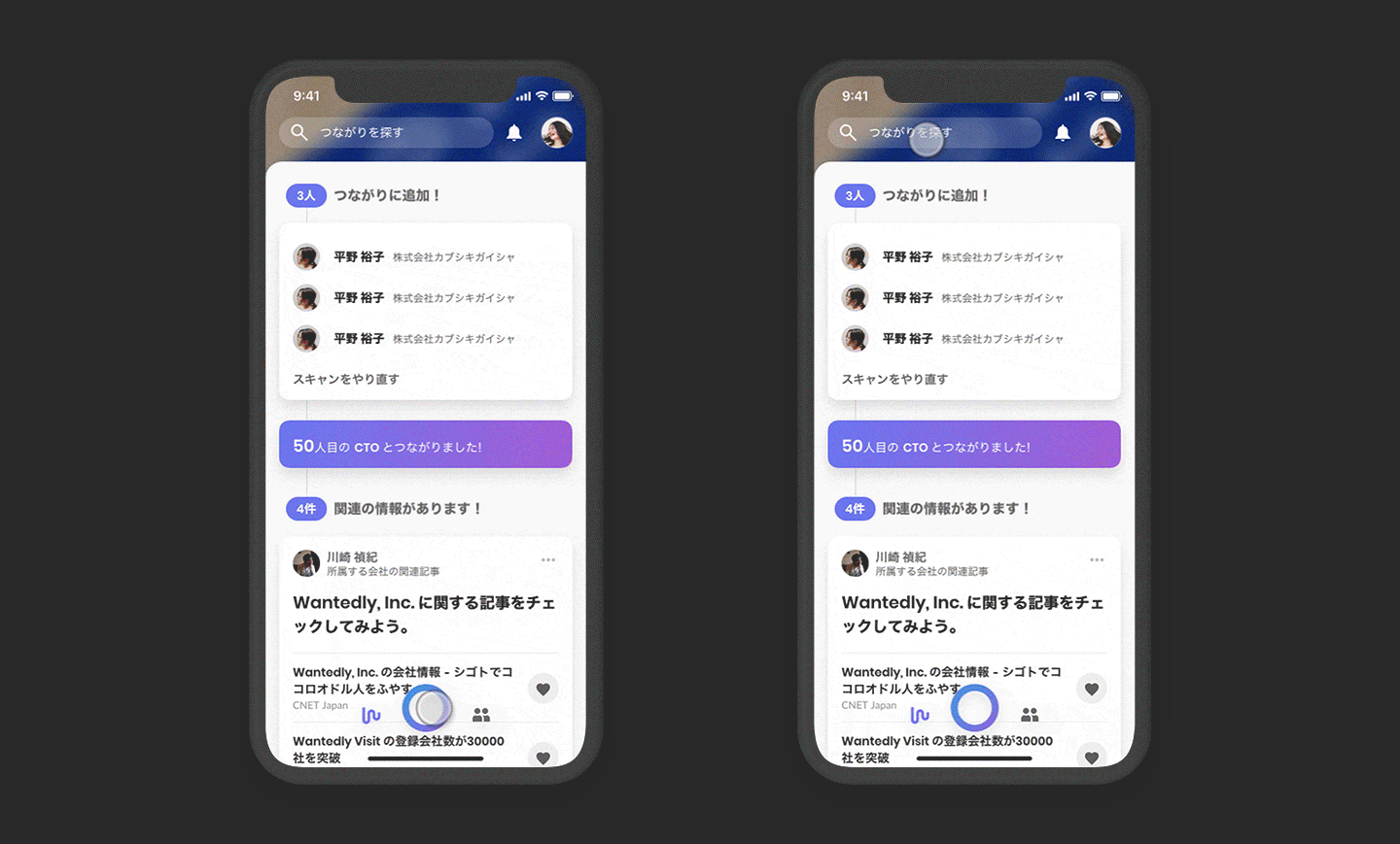 Wantedly People アプリのナビゲーションを刷新し、従来個別の画面/機能であった「スキャン」「確認と保存」「関連情報の提供」を流れるような一連の体験に再整理。シンプルな画面構成の中で、名刺スキャンを起点とした新たな体験への広がりを作り出している。