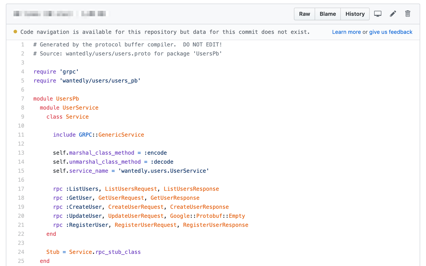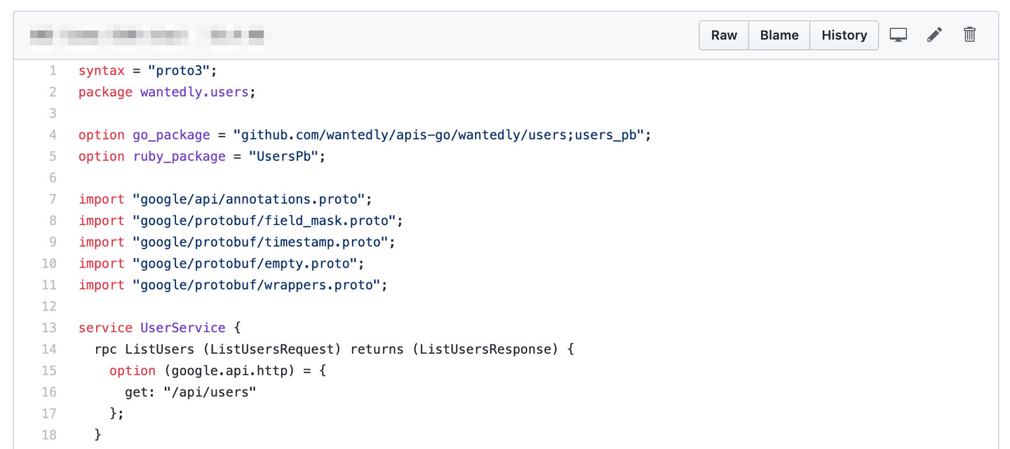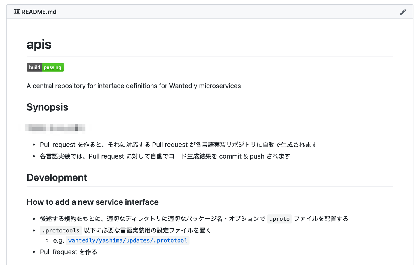 Service definition を Protocol Buffers IDL で .proto file に記述 protoc を利用して、Server コードを自動生成 Server の実装を書いて実行 上記の step のうち、「1. Service definition を Protocol Buffers IDL で .proto file に記述」と「2. protoc を利用して、Server コードを自動生成」については、wantedly では「apis」という名前の repository を利用しています。まずはこの部分について説明します。