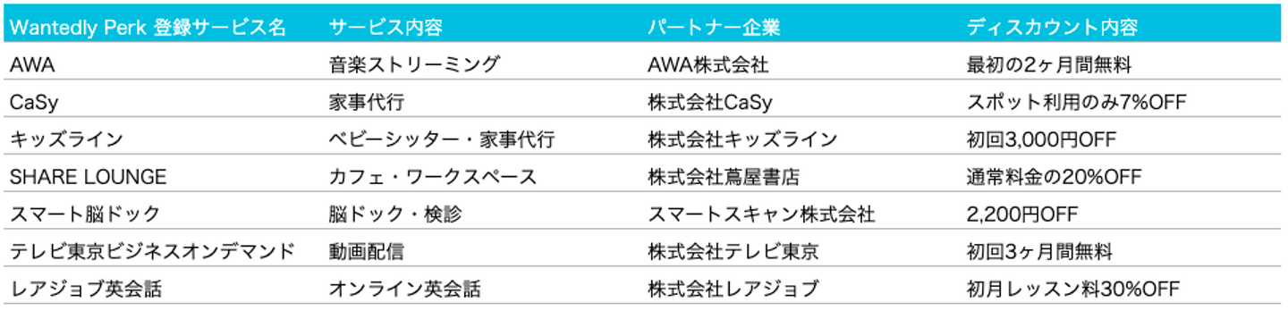 Perk とは、Wantedly有料プラン利用企業に所属する従業員及びその家族(LGBTや事実婚などのパートナーも含みます)が様々なサービスを安価に利用することを実現する福利厚生サービスです。