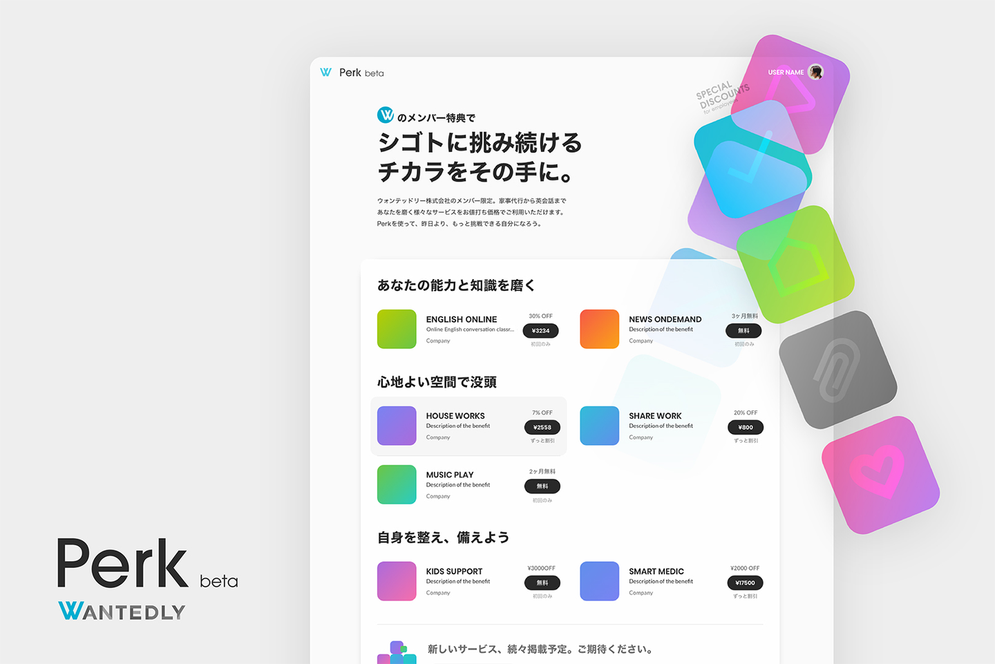 ウォンテッドリーは、Wantedly利用企業の従業員の定着、活躍をサポートすることを目的としたエンゲージメント事業を開始します。エンゲージメント事業の皮切りとして、従業員が様々なサービスをリーズナブルに利用できる福利厚生サービス「Perk」のβ版をWantedly利用企業へ無償にて提供開始します。また Perk へのサービス掲載パートナー(以下、パートナー)を掲載費無料にて募集開始しました。