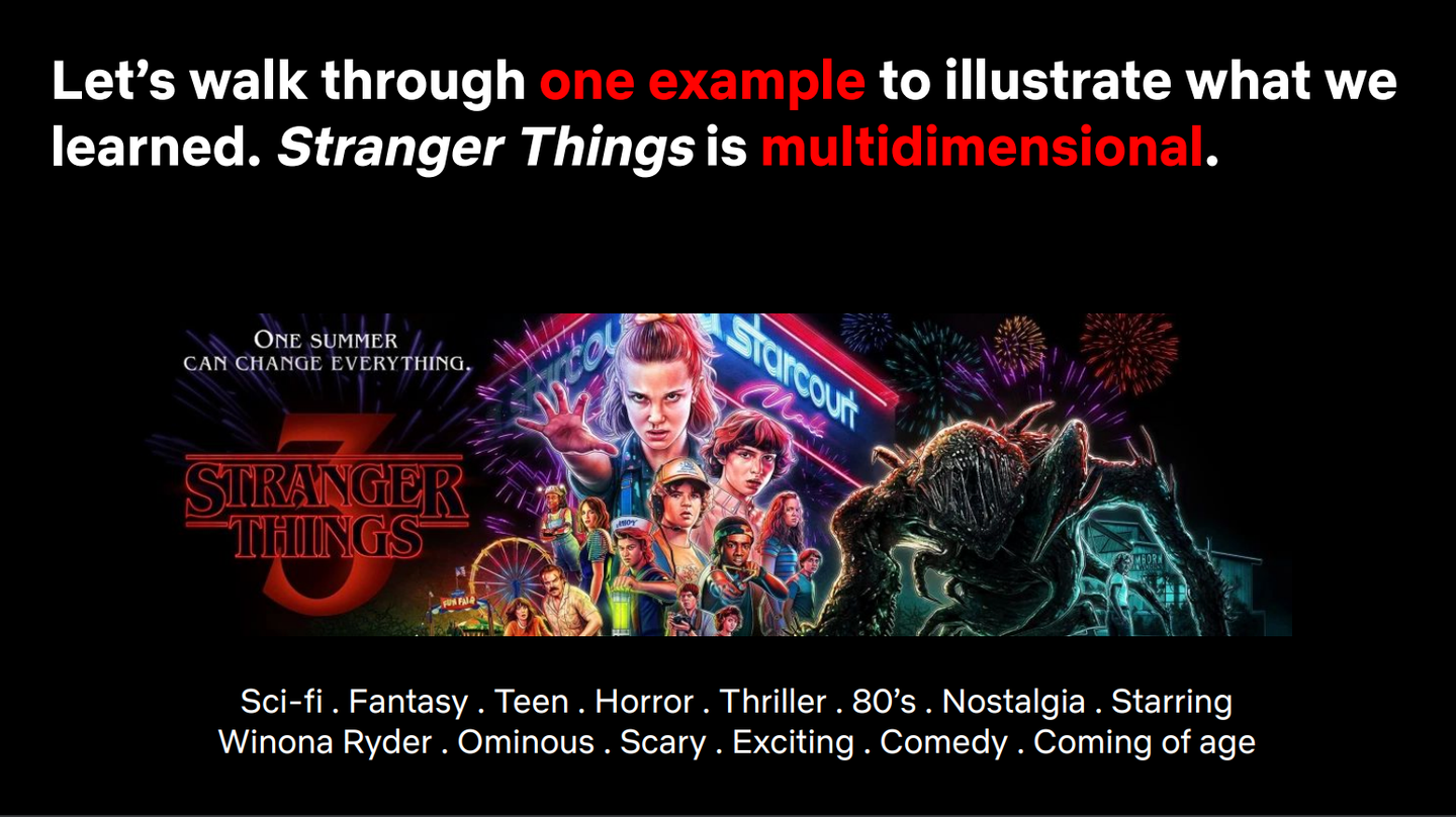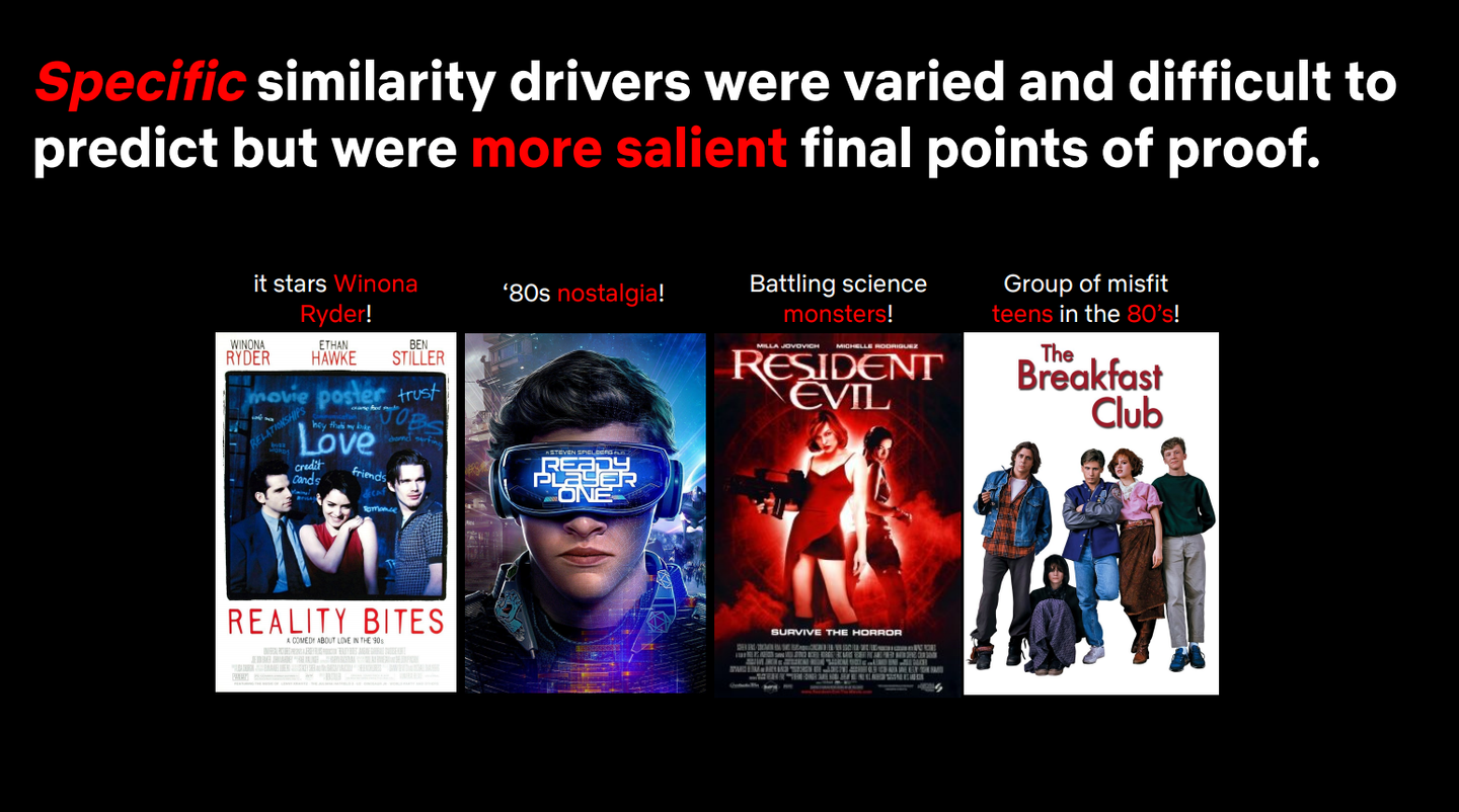一方でこのような特徴が一致しているからといって、コンテンツとコンテンツが「似ている」とすべてのユーザが判断するわけではありません。主演が同じだから似ていると判断するユーザもいれば、主演が同じだからといって似ていると感じないユーザもいます。「Group of misfit teens in the 80’s」という特徴はコンテンツの内容をある程度把握していて知識がないと存在にも気づけません。「nostalgia(懐かしさを感じる)」などはかなりユーザの感性に頼った特徴であり、特定のコンテンツに対して「nostalgia」とユーザが感じるかどうかはその人次第です。ユーザが「nostalgia」と感じていないのにも関わらず「nostalgia」という特徴が一致しているからという理由でコンテンツを推薦してしまうと、そのユーザにとっては推薦を大きく外しているように感じられてしまい、推薦システムへの信頼性を失ってしまう恐れがあります。