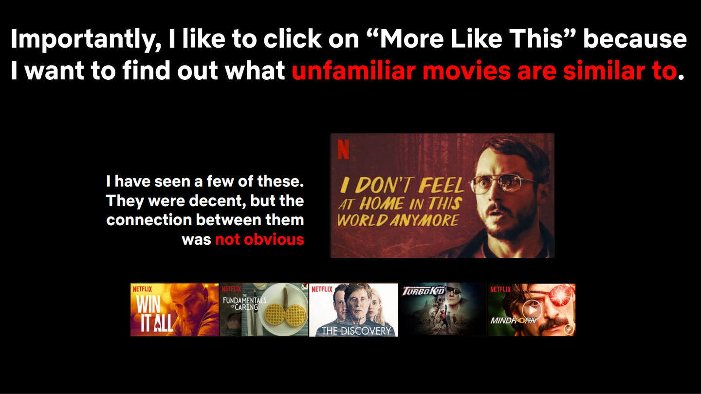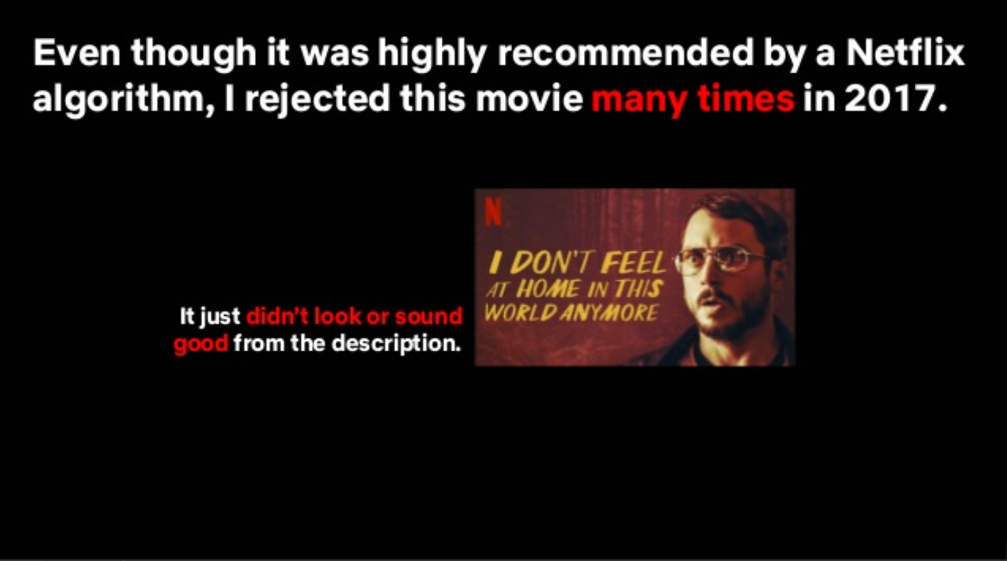 Netflix の叡智を結集した高度なアルゴリズムによってレコメンドされたコンテンツであっても、コンテンツの詳細を確認する限り自分が視聴したいと思えるものではないと何度も拒否をした(視聴しなかった)というスピーカーの原体験から話が始まります。 実際のコンテンツ(I Don't Feel at Home in This World Anymore)を例に出していて面白かったです。(Netflix オリジナルコンテンツだからセーフなのだろう。)