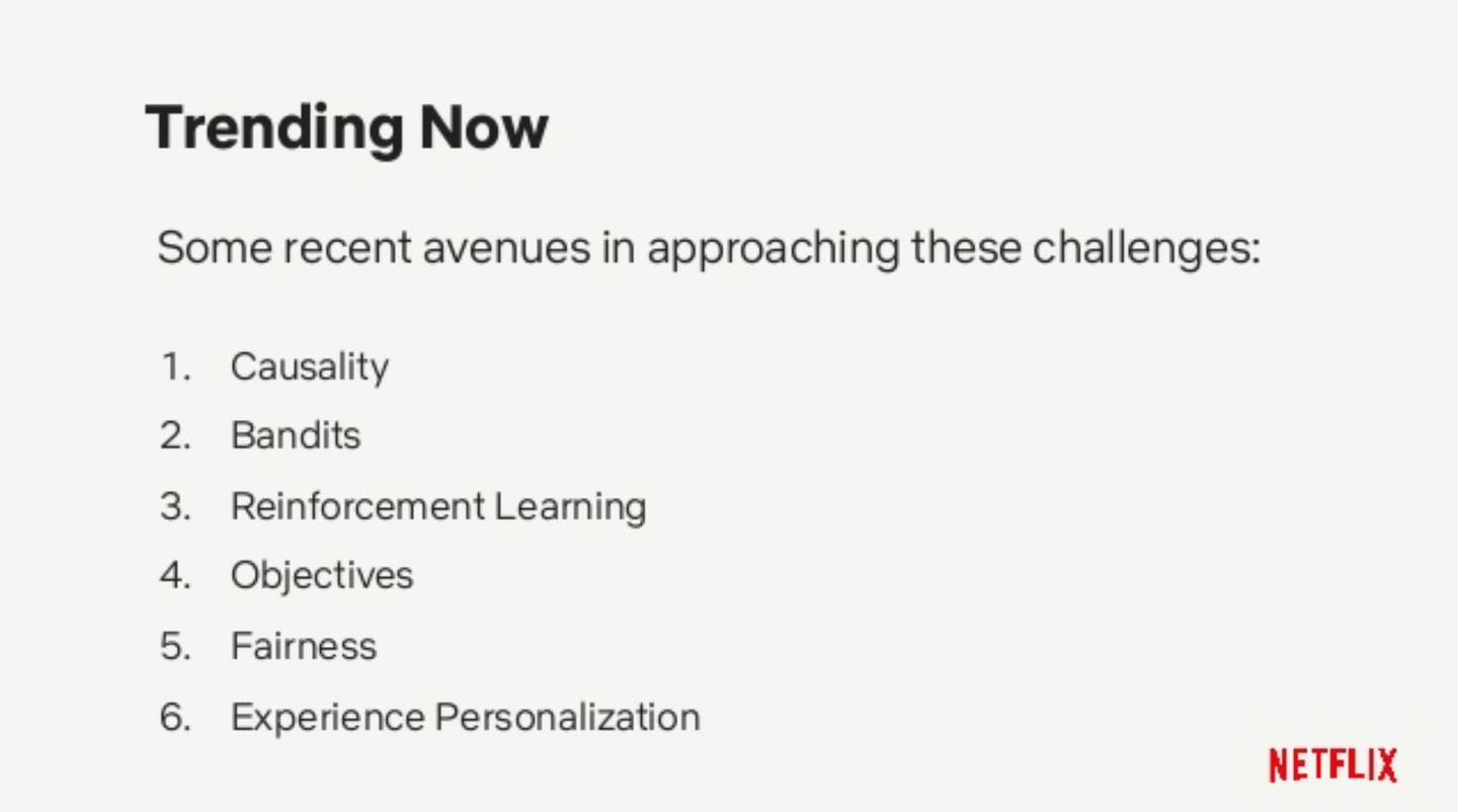 Netflix は推薦システムの研究開発・実サービスでの応用に大変積極的で、推薦システムのトップカンファレンスである RecSys のスポンサーにも RecSys2010 から今回の RecSys2020 までの11回のうち RecSys2013 を除く(なんでだろ) 10回なっており、論文もたくさん通しています。推薦システムの関するブログなどの発信もたくさんあり私自身普段から大変お世話になっています。Netflix のサービスにおいて推薦システムは大変重要な立ち位置にあり、少し昔のブログでの言及にはなりますが、Netflix の全ての視聴のうち 75% はユーザの能動的な検索活動ではなく、推薦システムによるレコメンドから発生しているとのことです。 ちなみにこのブログで語られている「Everything is a Recommendation」という言葉が私は好きです。