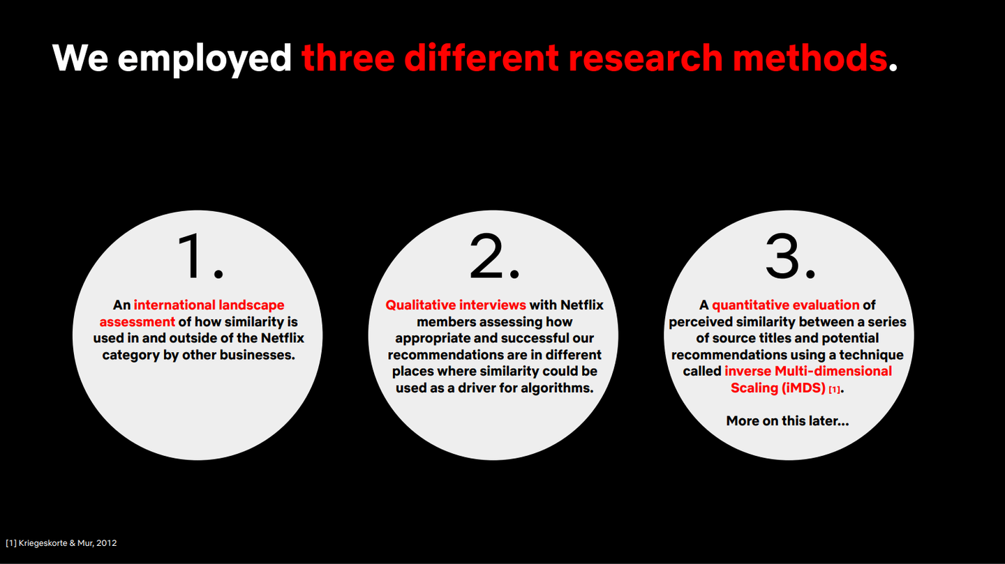 このような経験から、”「類似性」とはいったいなんなのか"という疑問が生まれた。あるコンテンツを説明するためにはどれほど「似ている」コンテンツである必要があるのか。その「似ている」に求められる程度は場合によって変わるのだろうか。「似ている」と「似ていない」の境界線はどこにあるのか。これらの疑問を解消するために、実際に Netflix のユーザ(Netflix は user という表現をあまり使わずにmember とう表現を利用するが、このブログでは特に留意していない。)を対象に調査してみた、というのがこの調査報告の内容となっています。