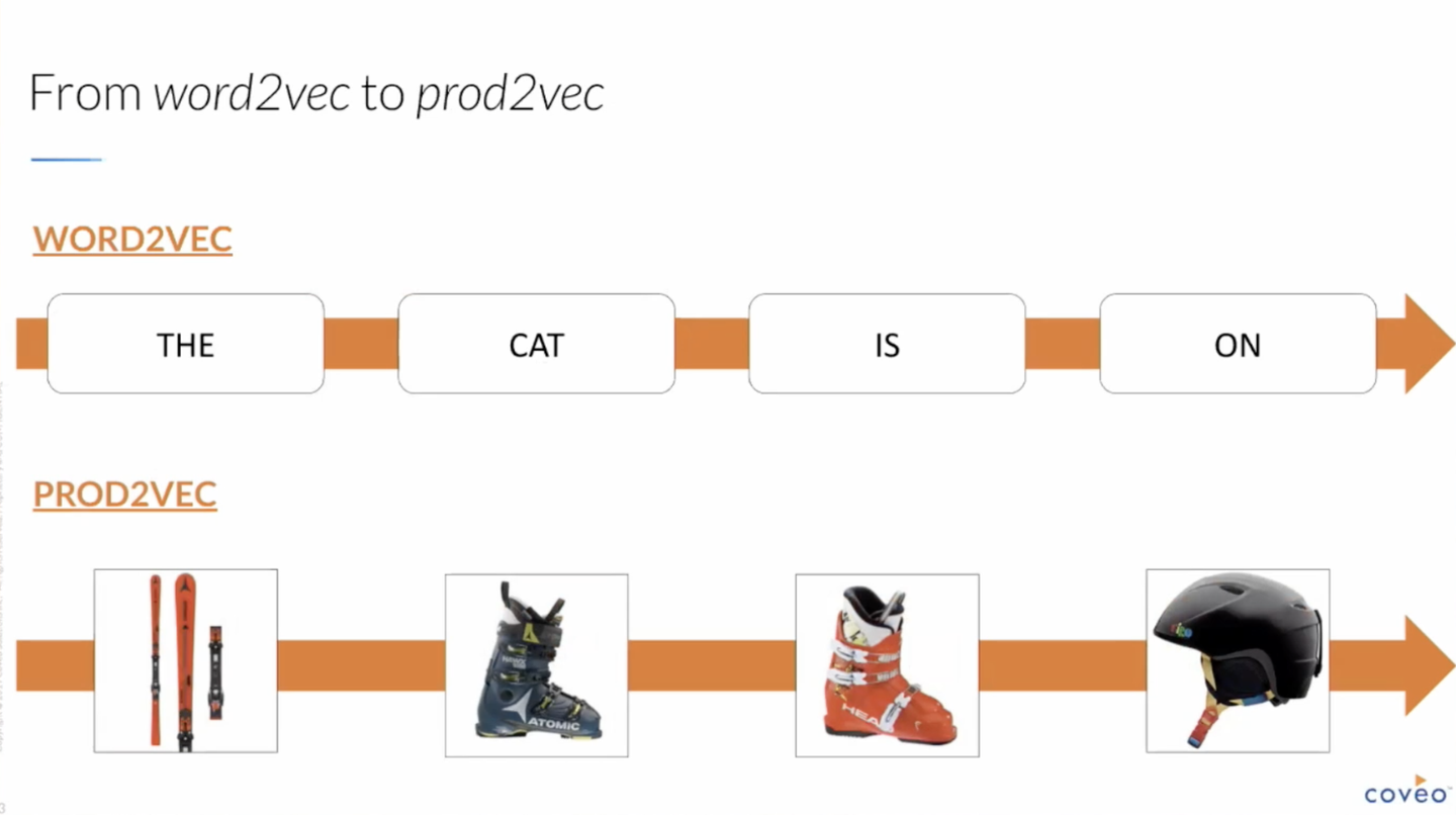 学習にはいろいろな方法が採用されますが、ここでは「同一セッションで閲覧したアイテムの時系列順の並び」を基に word2vec 的な方法で学習する prod2vec が紹介されています。