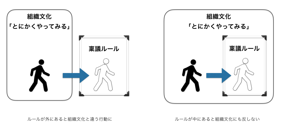 前述の例の続きで、「会社のお金を使う場合は1円以上から稟議が必要」というルールがある会社に「とにかくやってみる」という組織文化があるとします。