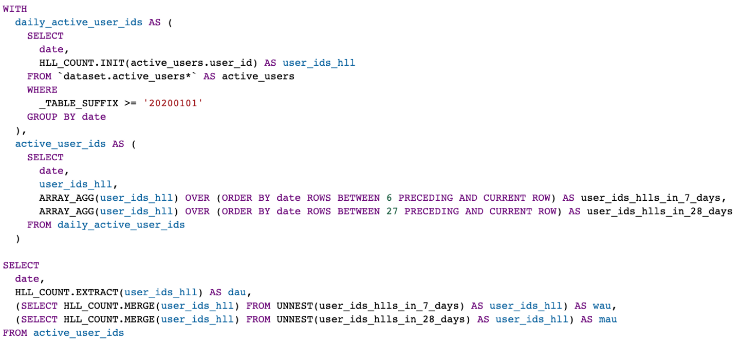 集計クエリでは得られたスケッチからカーディナリティを推定することで、最終的にDAU/WAU/MAUを近似集計します。これらの近似集計はHyperLogLog++関数を用いて実現しています。COUNT(DISTINCT)などの集計関数と比較すると統計的な不確実性が生じる一方で、大幅なパフォーマンス向上が期待できます。*2