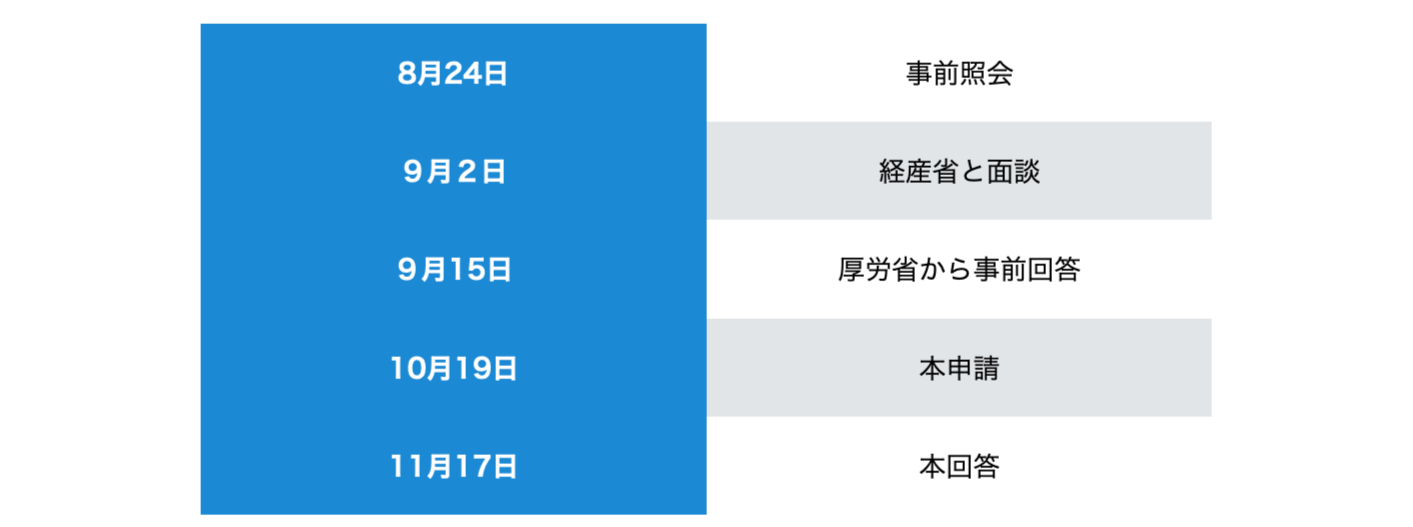 今回も、事前に作成した申請書をベースに、経産省側の担当者の方と、新機能の説明、法的論点、これまでの議論の経緯などを共有しつつ、十分な事前協議を行いました。その後、厚労省側から当社として納得できる内容が得られたため、そのまま本申請に進むことにしました。
