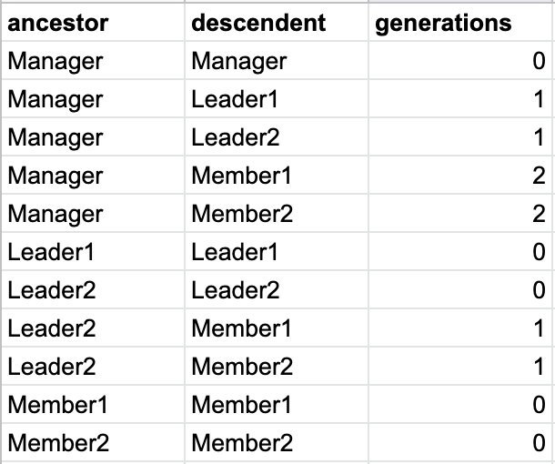 このとき、対応する閉包テーブルのレコードは以下のようになります。Manager と Member1 は上司部下関係として直接つながっていませんが、generations = 2 として保存されているところがポイントです。