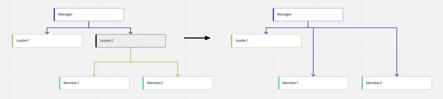この操作を行うためには、削除対象の部下と、削除対象の直属の上司をadd_relationを用いてつなげ、