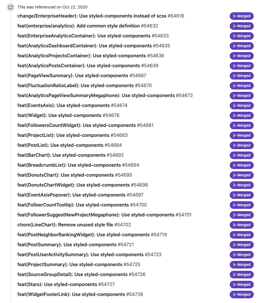 実際には想定+αの 2.5 日程度で書き換えが完了しました。(途中ミーティング等もあったので、実働では2人日程度。) ただし PR 数が 30 程度になり、全てを細かくコードレビューしてもらうのは厳しいという状況になってしまいました。そのために動作ベースのレビューという形に方針転換し、エンジニア向けのテスト環境に2時間程度デプロイして、社内に呼びかけを行い、壊れている箇所がないかのチェック・既存のスタイルと乖離している部分がないかのチェックを行いました。チェックで洗い出した箇所を再度修正して master にマージすることにより、以後の開発がスムーズに進むようになりました。下のスクリーンショットはあるページを styled-components に置き換えたときのリリースブランチの様子です。