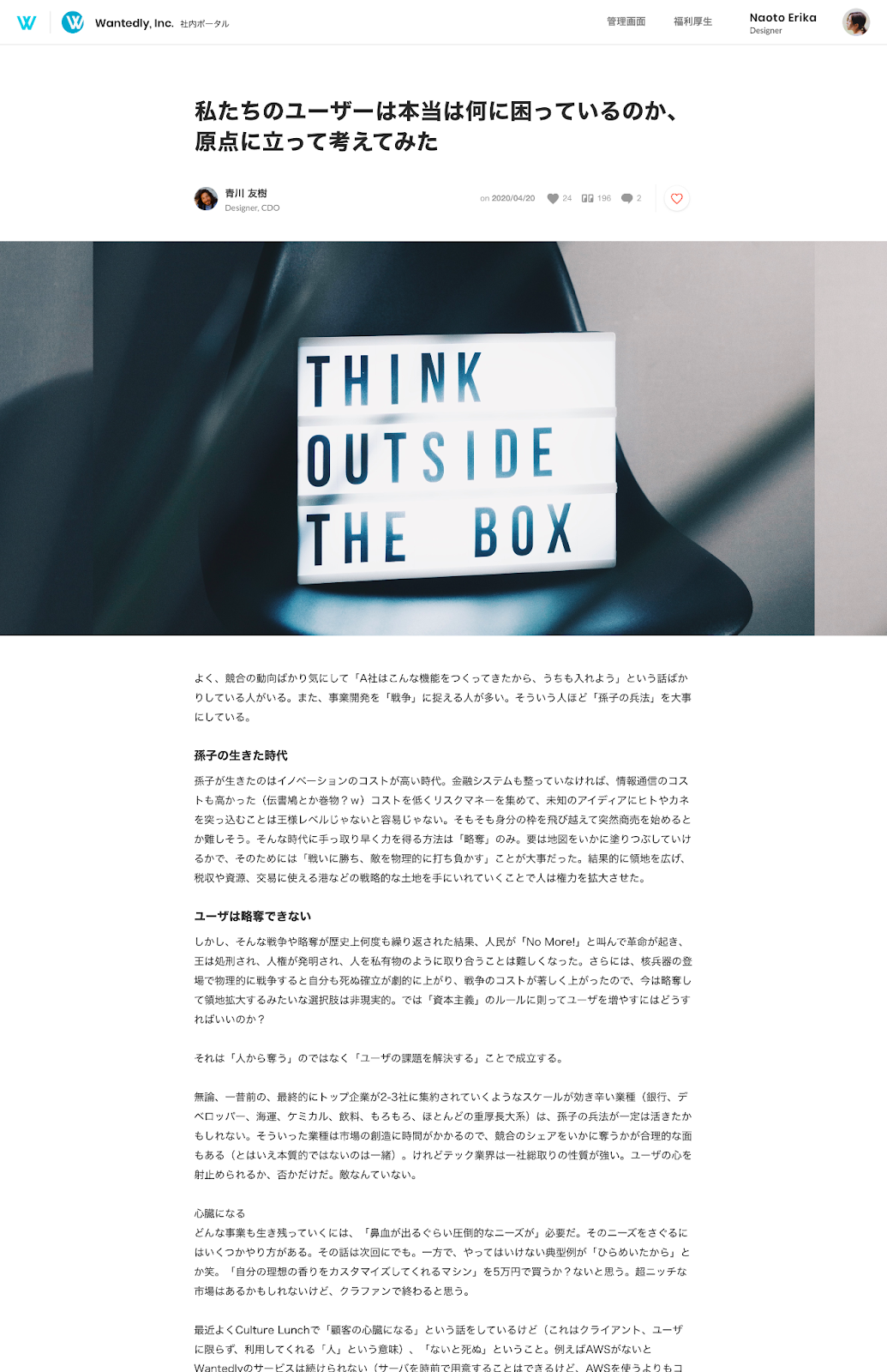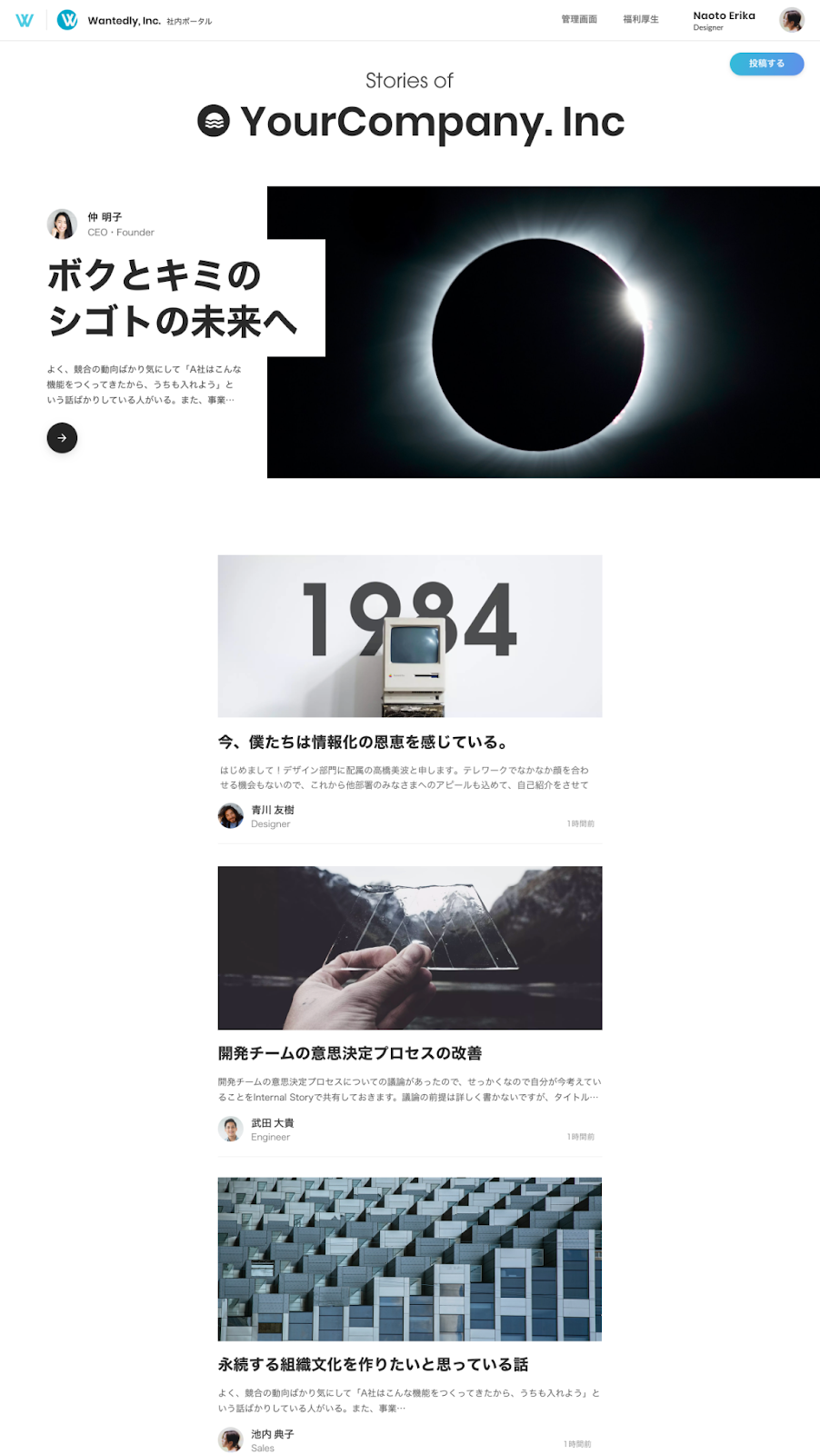 Wantedlyご契約企業は記事投稿プラットフォーム「Story」を通じて採用広報を目的とした社外向けのブログ記事や、社内限定の社内報をオンライン上で発信できます。社内報のフォーマットはシンプルなデザインで、読んだ従業員は社内報に対していいね!やコメントをすることができ、紙の社内報では難しい相互コミュニケーションが可能です。また、Wantedlyの社内ポータルページから過去公開された社内報の一覧を閲覧することができるため、振り返りや管理も簡単です。