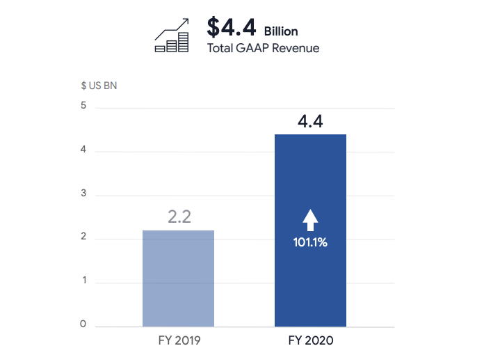 2020年の業績を見てみると、Revenueは年間44億ドル(1ドル=110円換算で約4,840億円)でYoY 101.1%と著しい成長を遂げています。時価総額は約1,500億ドル(1ドル=110円換算で約16兆5,000億円)となっています。