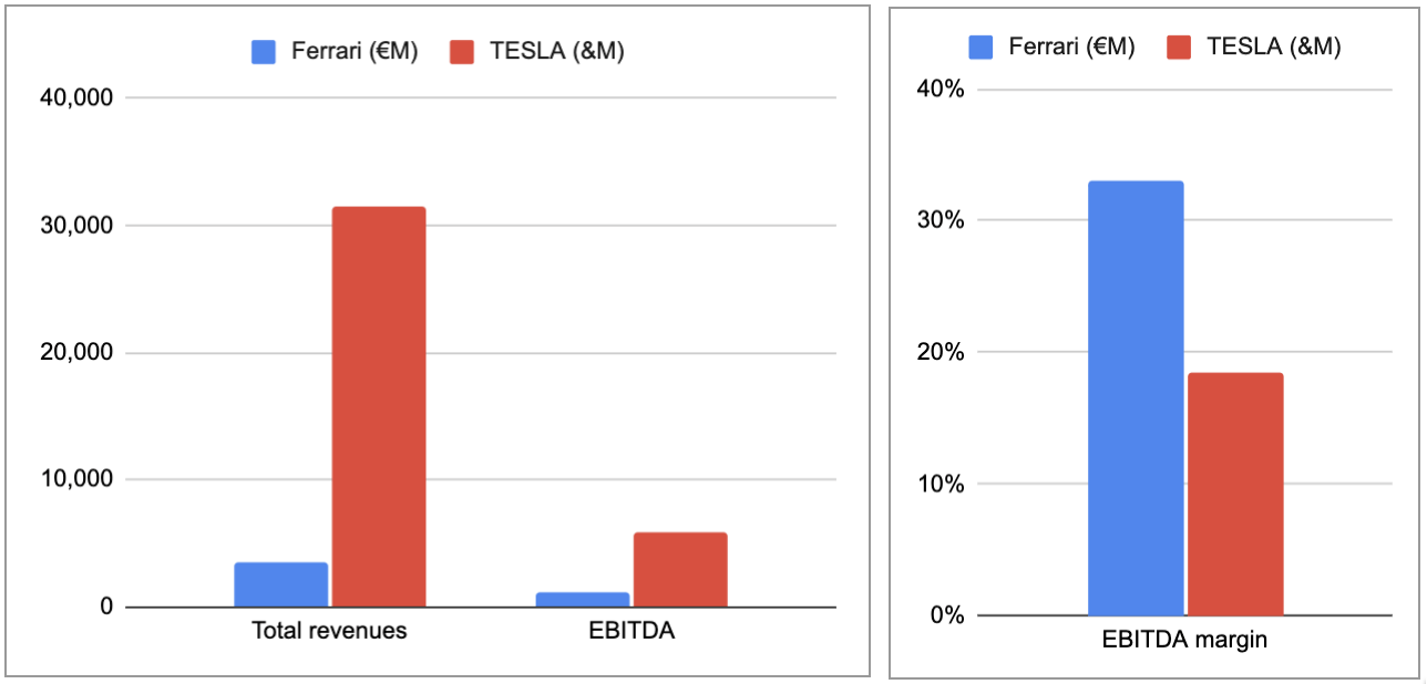 EBITDA marginを見るとフェラーリは2021年Q2で37%、2020年通期で33%で、テスラはQ2で20%、2020年通期で18%です。ちなみにトヨタ自動車は10%程度なので、両社の収益性の高さがわかります。