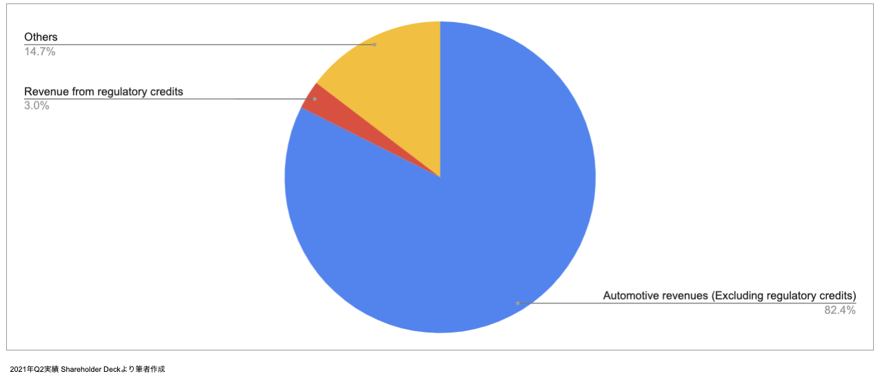 次に、テスラの収益の中身を見てみたいと思います。Q2の実績を見ると約8割が自動車関連の収益となっています。テスラは自動車メーカー・EVメーカーとして認知している方が多いかもしれませんが、ソーラーパネルや蓄電池などエネルギーに関する事業も行っています。