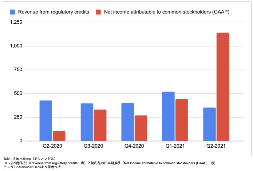 CO2の排出権取引無しで黒字化 〜テスラ テスラは2021年Q2の決算発表で、ついにCO2排出権取引無しでの黒字化を果たしています。これまで、CO2排出権取引の利益貢献が大きく、主力事業とも言える自動車の製造・販売では赤字が続いていました。自動車の製造には一般に大規模な設備投資が必要になるため、その償却費を賄って黒字化するためには、製造と販売の規模を安定的に大きくする必要があります。CO2排出権取引無しで黒字化を果たしということは、自動車の製造・販売のみで事業が成立することを示しており、テスラの事業継続性に懐疑的だった人々に対して大きな事実を突きつけることになります。