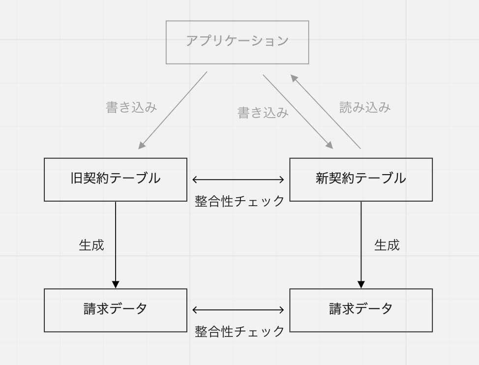ただし、契約や請求といったデータはお金に関わる部分であり、データをバッチ移行してすべての読み込み・書き込み先を一気に置き換えるといった移行のしかたは危うすぎます。データの移行やアプリケーションコードにどこか一つでもミスがあれば、顧客に誤った請求がされてしまう可能性があるからです。