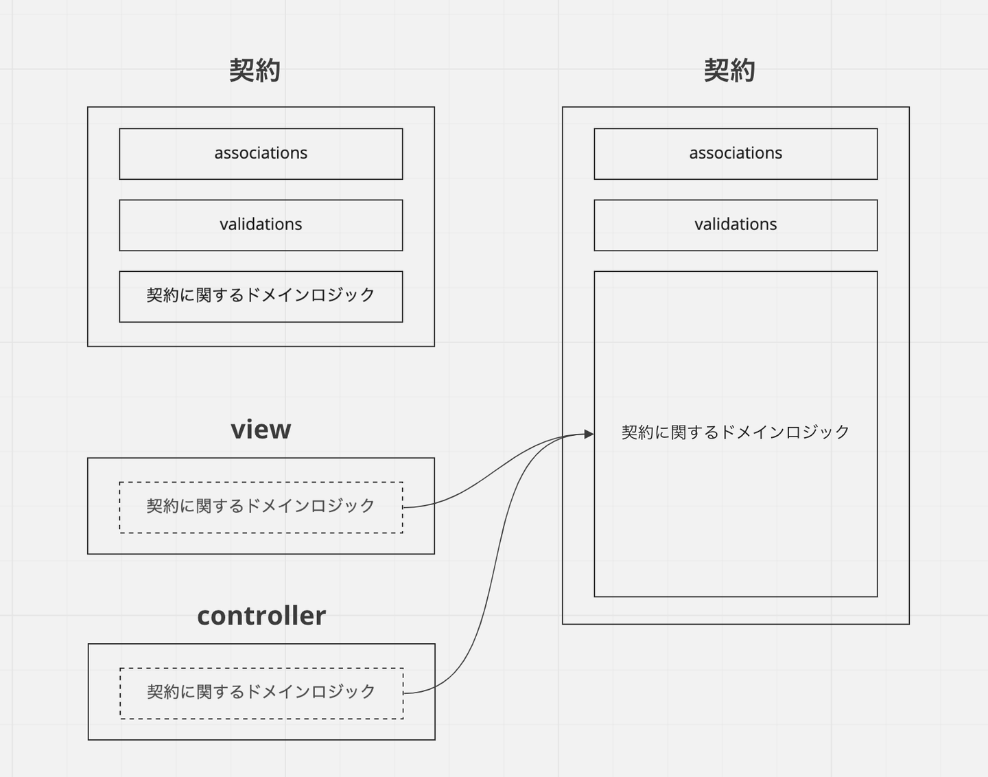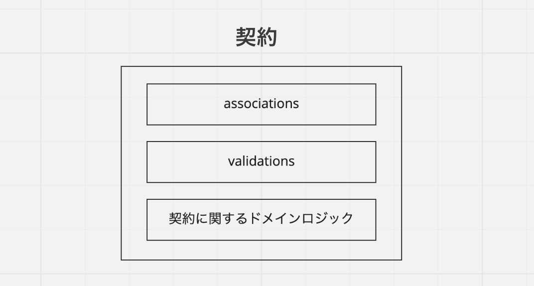 これでめでたしめでたし....では残念ながらありません。責務外の処理を切り出していった結果、実は契約モデルの中身がかなりスカスカだということがわかります。契約というオブジェクトに関するドメインロジックが少ししか書かれていません。
