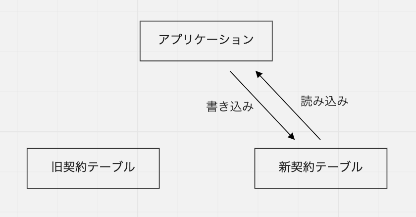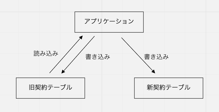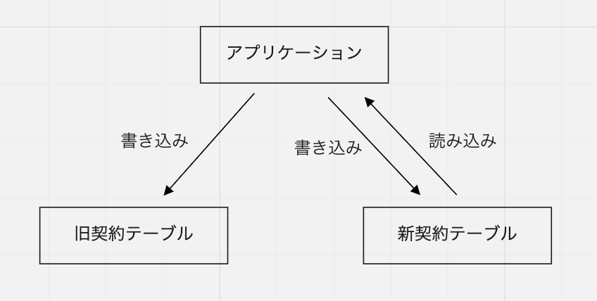 既存のデータをバッチ移行したら、アプリケーションから新旧両方のテーブルに同時書き込みを行うようにします。実際には、この同時書き込みを行うコードをフラグでオフにした状態で先にデプロイしておき、バッチ移行の実施と合わせてフラグをオンにして有効化しました。