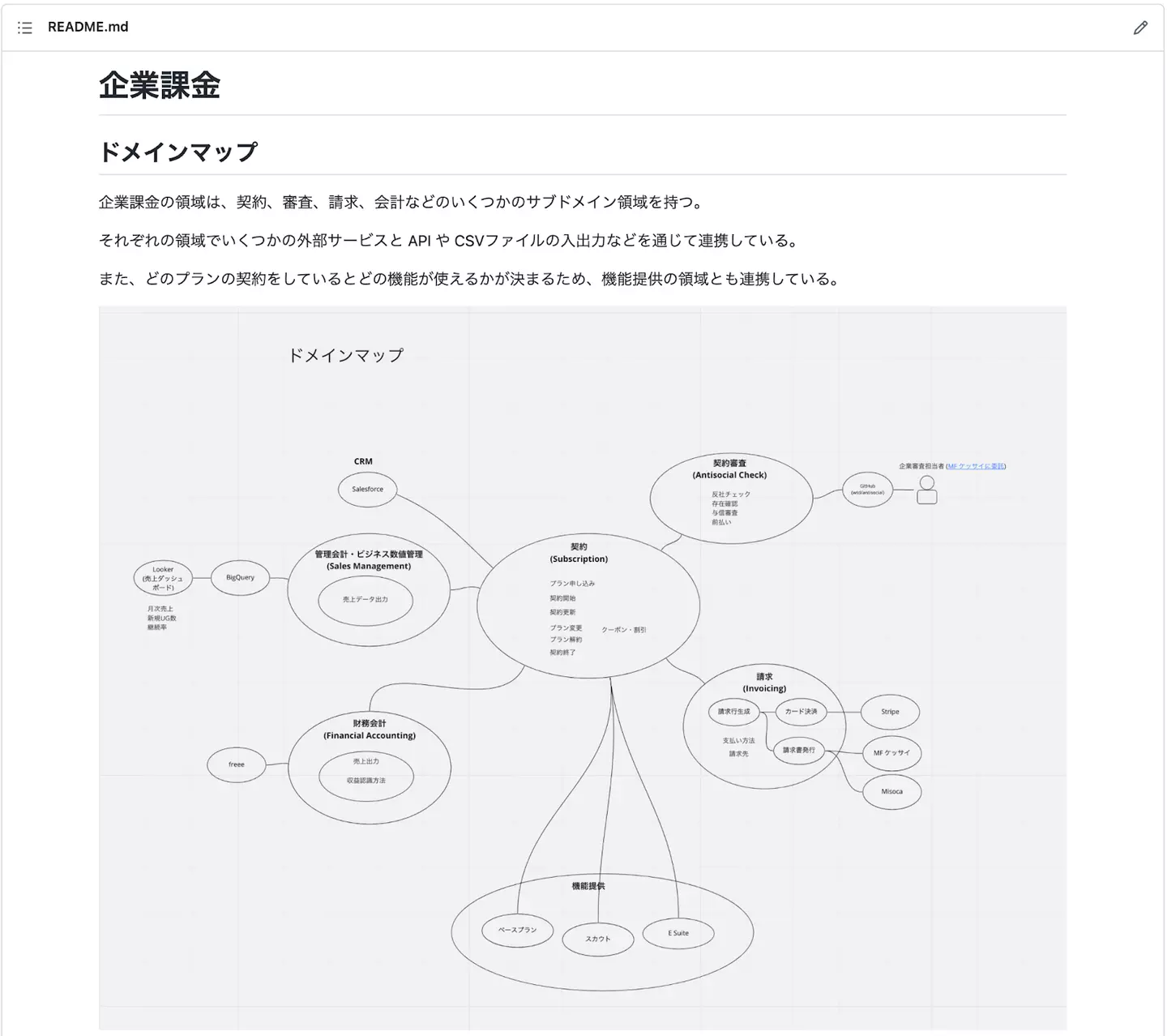 ドキュメントは、まずドメインの概観がつかめるものがあるとよいですね。今回のドメインでは、機能追加で新たに加わった領域も含めて、いくつかのサブドメインが存在したので、入り口としてドメインマップのドキュメントを書きました。