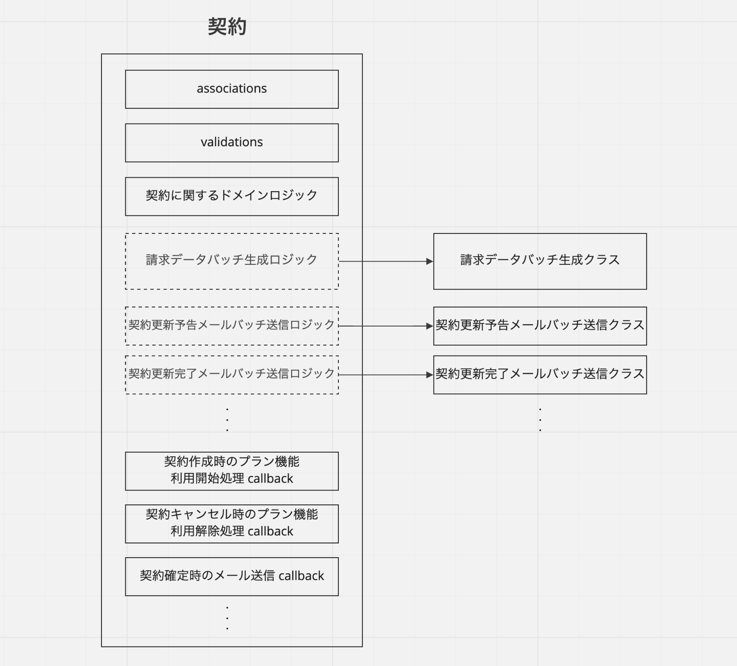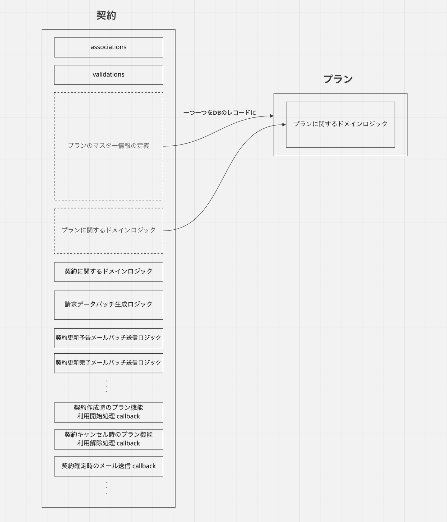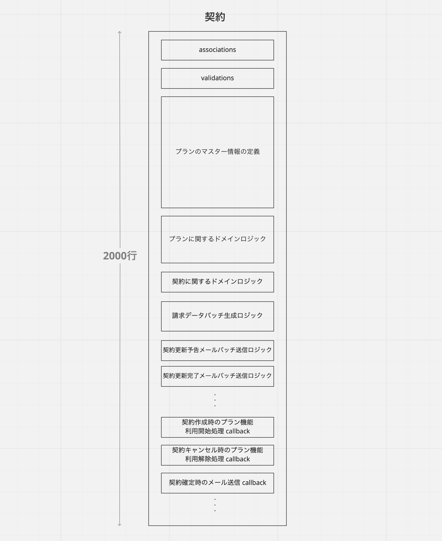 コードが構造的に整理されていることは、システムの理解と変更のしやすさにつながります。中でも最も重点的に取り組んだのは、いわゆる Fat モデルの分解です。例として、プロジェクトが始まる前の旧契約モデルのコードは以下のような構造になっていました。契約モデルの本質的な責務でないような、プランのマスター情報の定義や各種バッチ処理などが数多く書かれていて、コードが膨れ上がっていました。