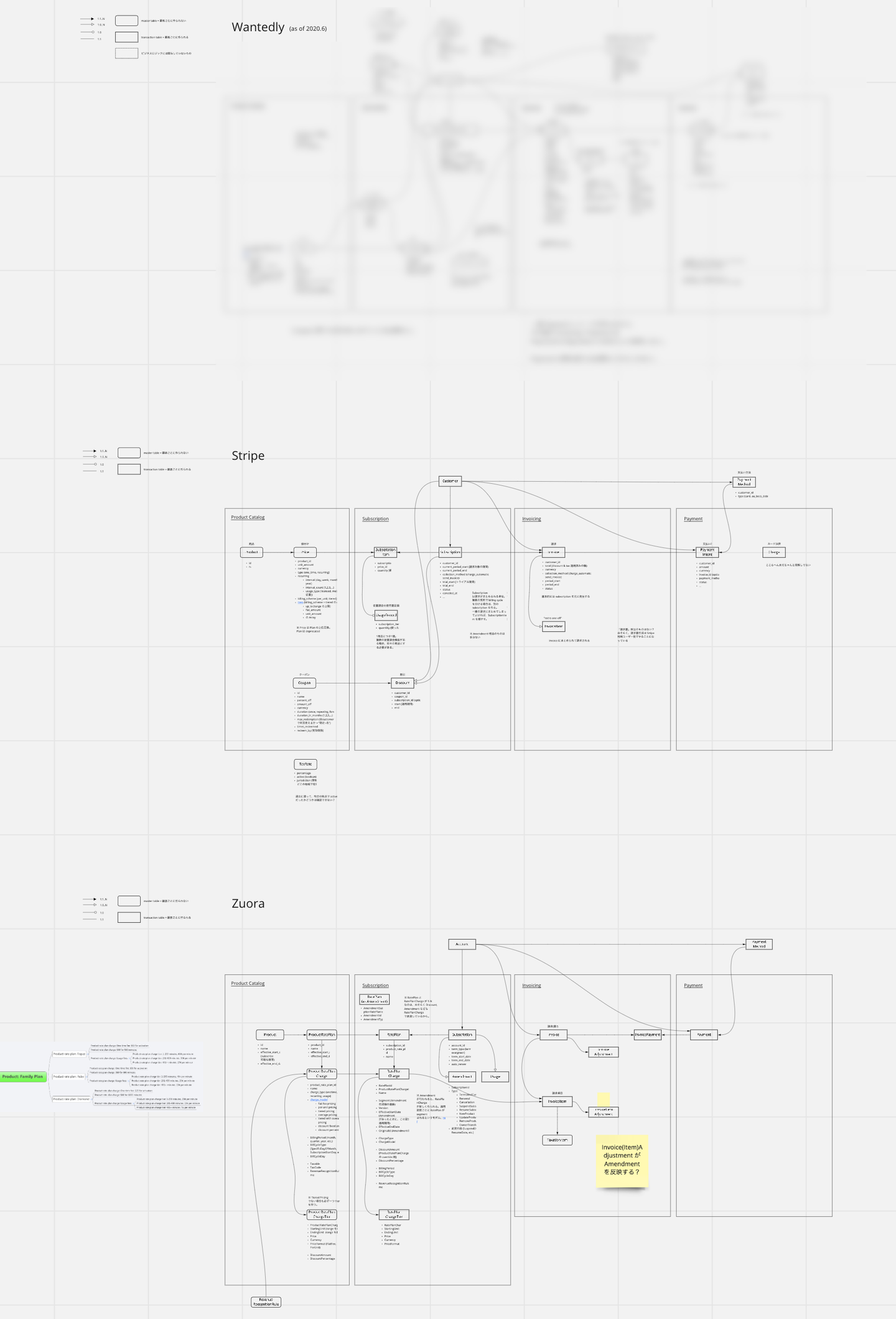 まず、同じドメインの SaaS である Zuora や Stripe のモデルを参考にして、自分たちの既存システムのモデルとの違いを比較しました。Stripe は比較的シンプルなモデルで、対して Zuora は重厚なモデルであり、自分たちの事業においてはどのあたりに落ち着かせるのがよいだろうかという点でも参考になりました。