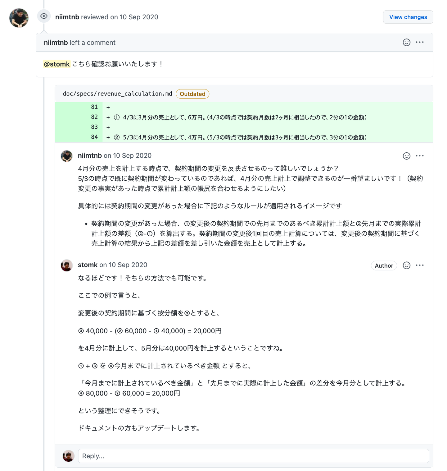 それから、各サブドメインの概要、各機能の仕様、主要モデルの関係図などもドキュメント化していきました。中でも数値計算が関わる部分、例えば今回のプロジェクトで新しく実装した財務会計用の売上データ出力機能では、売上の計算のしかたや出力データの内容について、GitHub でドキュメントを書き、経理メンバーにレビューしてもらいました。こうすることで開発中に仕様を詰めていきながら、同時にドキュメントができあがります。