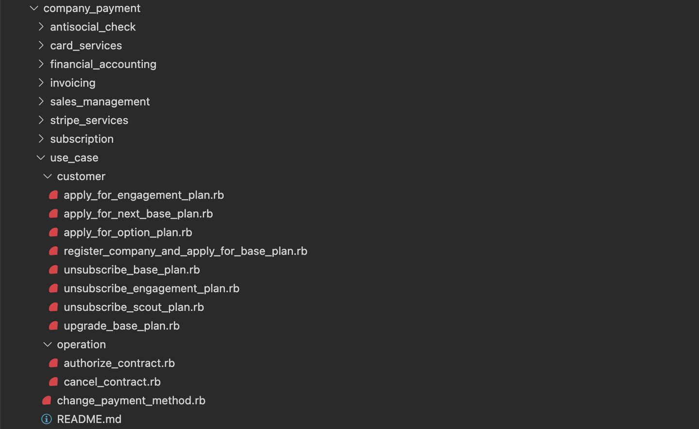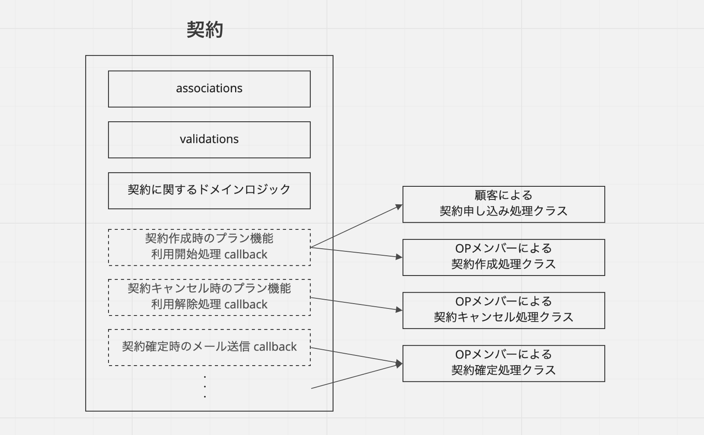 最後に callback 群ですが、これらはドメイン駆動設計で言うところのアプリケーションサービスにあたる、一段上のレイヤーのクラスに移していきました。例えば、契約モデルの create や特定のフィールドの update の callback で行われていた処理は、「契約申し込み処理」「解約申し込み処理」といったドメインの具体的なユースケースを表すクラスに移ります。これにより、特定のユースケースにおける処理のフローがかなり理解しやすくなりました。また、契約データのように、顧客のアクション起点でも、社内のオペレーション起点でも変更が行われるようなものも、変更時の副次処理がそれぞれのアクターごとのユースケースクラスに移動したことで、こっちを変える意図で変更したらあっちにも影響が出てしまったといった意図しないバグが入りにくい構造になりました。