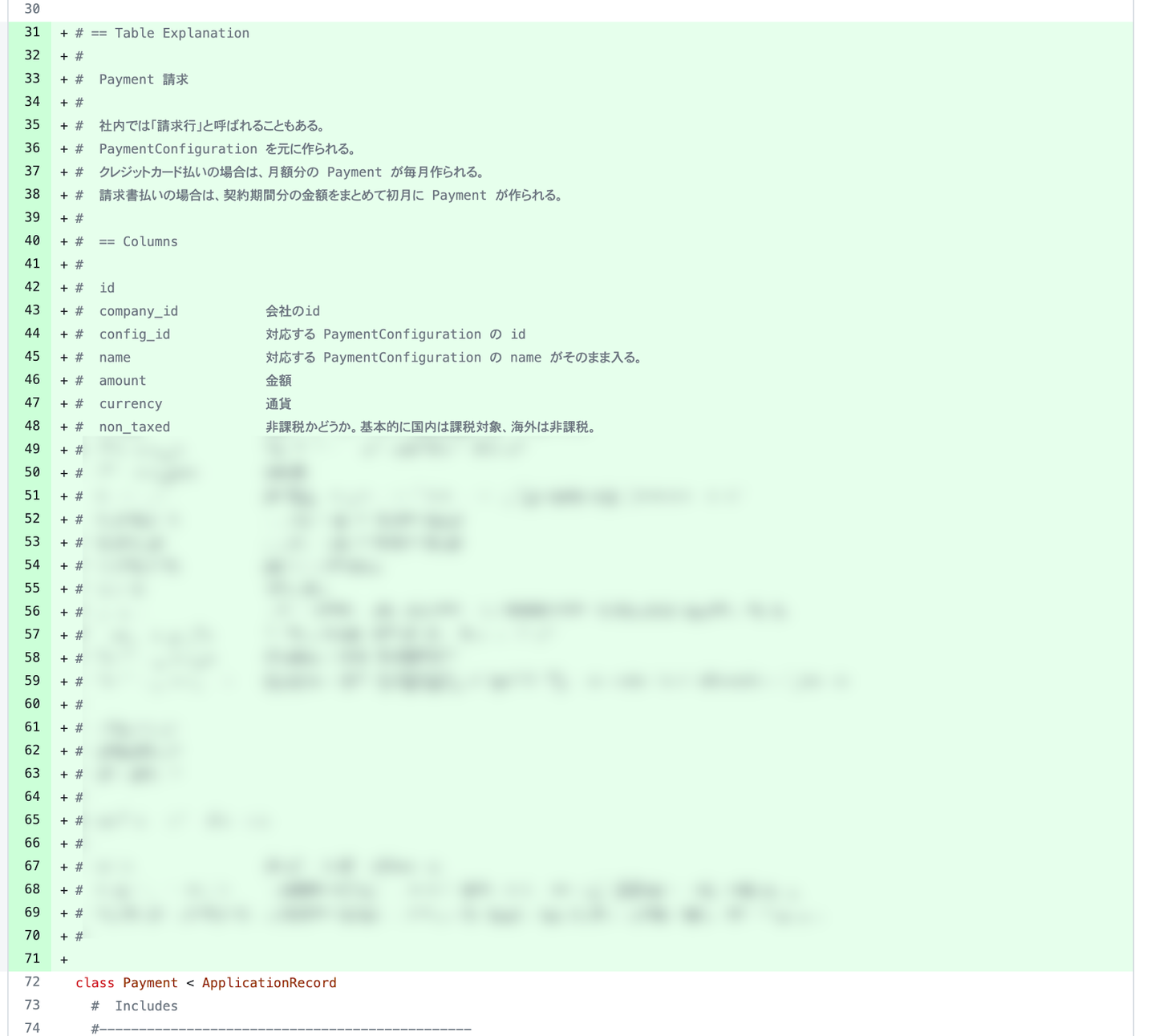 続いてコードコメントですが、プロジェクトの初期に、まず既存システムを理解するために、各モデルの役割やカラムの意味を調べてコメントで書いていきました。これはやってみてとてもいいなと感じたので、以後新しく作るモデルにも同様に書くようにしました。