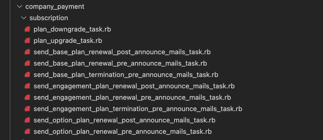 続いて、各種バッチ処理はそれぞれ個別のクラスに切り出していきます。切り出したクラスはサブドメイン領域ごとに名前空間を切って収めていきました。一つ一つが小さいクラスになったことでコードの理解がしやすくなったほか、ディレクトリを見ればどのようなバッチ処理が存在しているのかが把握しやすくなりました。