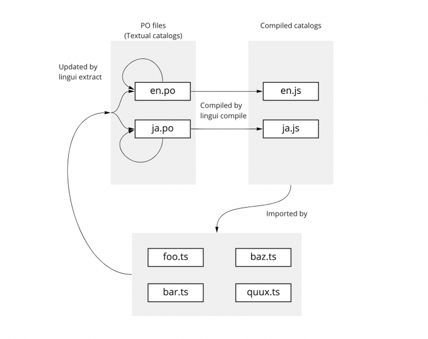 xgettext(1): アプリケーションコードから翻訳テキストの呼び出しを検索し、翻訳テンプレートを生成します。 msginit(1) / msgupdate(1): 翻訳テンプレートをもとに各言語の翻訳ファイルを更新します。 msgfmt(1): 翻訳ファイルをバイナリにコンパイルします。 gettext(3): バイナリの翻訳ファイルをアプリケーション内に読み込みます。 LinguiJS LinguiJS はgettextと似ていますが、potファイルを持たずに直接poに対して同期を行います。また、翻訳データはjsファイルにコンパイルされアプリケーションに直接リンクされます。 (一般的な方法でバンドラーを構成している場合)