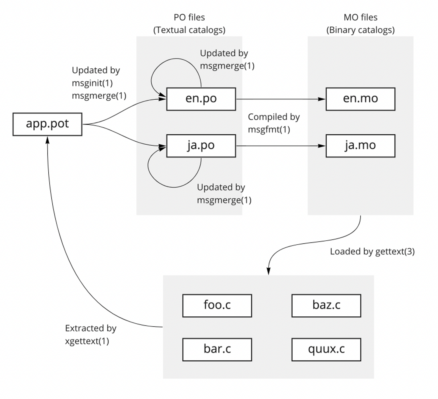 GNU gettext たとえば、 GNU gettext の翻訳ファイルはおおよそ以下のようなライフサイクルを持ちます。