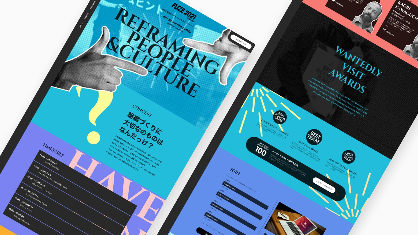 第二回となる、採用と組織づくりをリードする為のイベント、FUZE。2021年は「Reframing People&Culture」をコンセプトに、カルチャー色を感じさせるビジュアルに。Wantedlyが文化創造企業であり続けたいという想いを表明した。