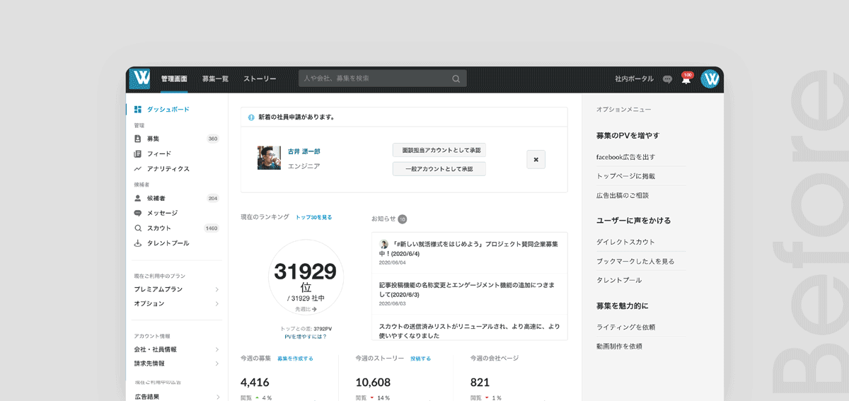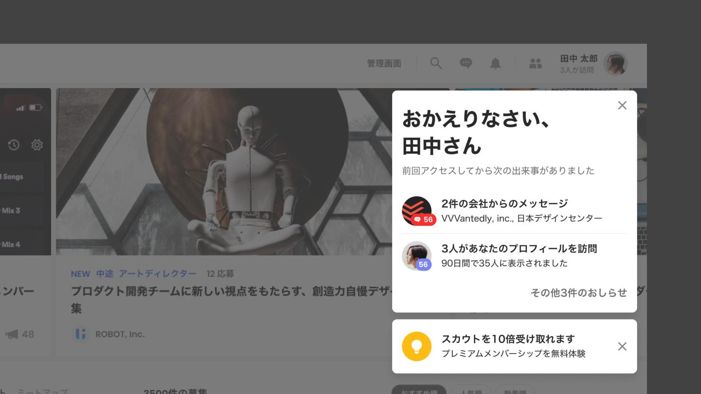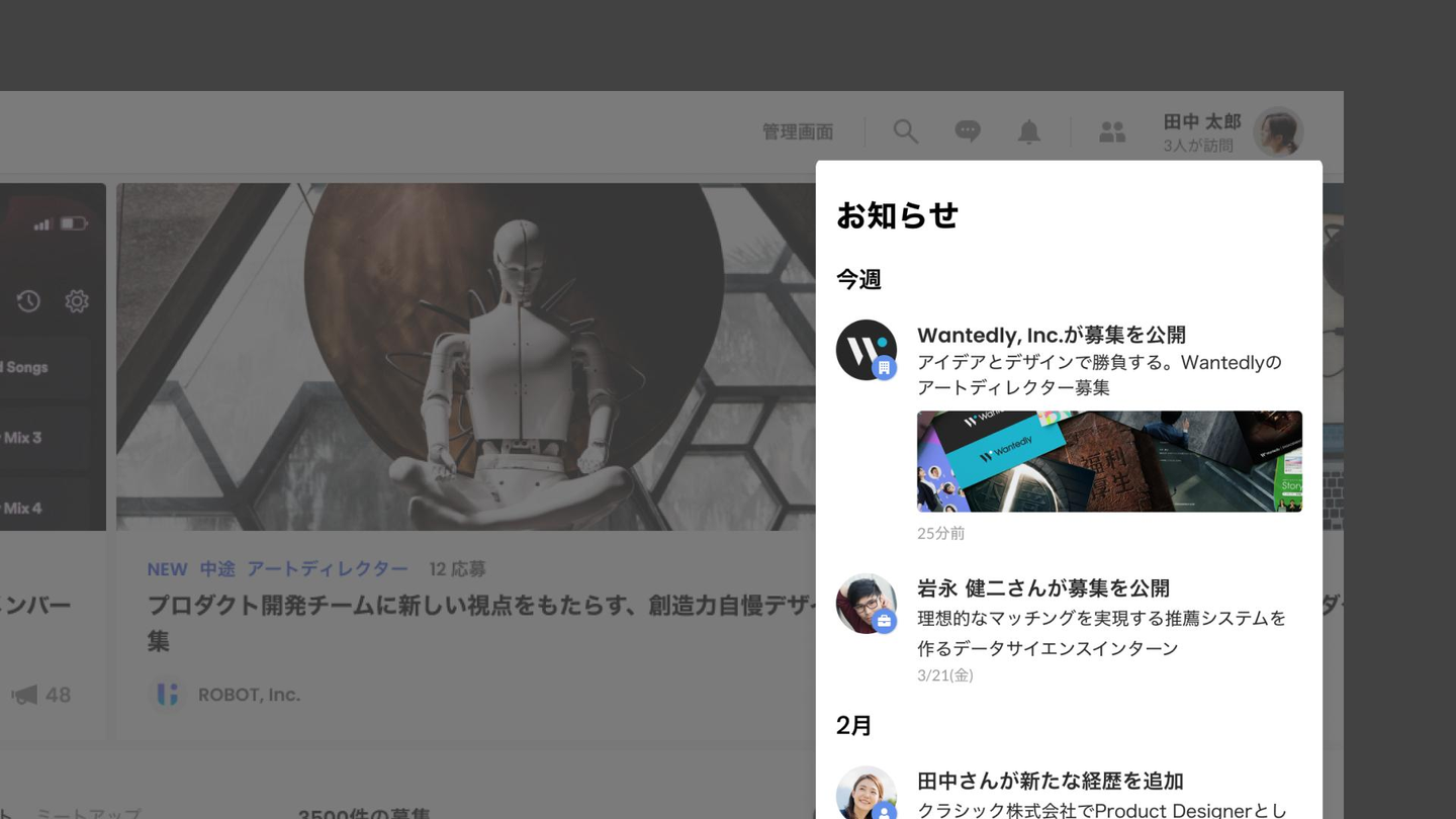 Wantedlyでの出来ごとを把握できる通知機能のデザインを刷新。画像つきの通知を加えることで通知内に強弱を持たせ、「この通知を見てみたい」と思えるようにした。それに加え前回アクセスしてからWantedlyでどんな出来事があったかを把握できる通知サマリーも新たに設計した。