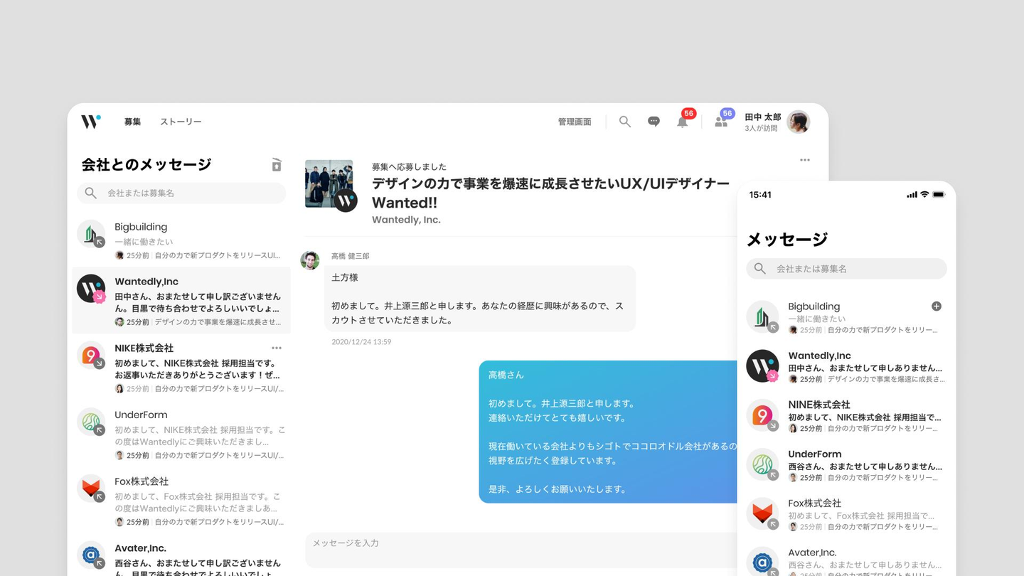 会社訪問までに「必要な」体験であるメッセージ画面のデザインを刷新。クロスプラットフォームで表示仕様を統一することで、共通のグロース施策を行いやすくした。