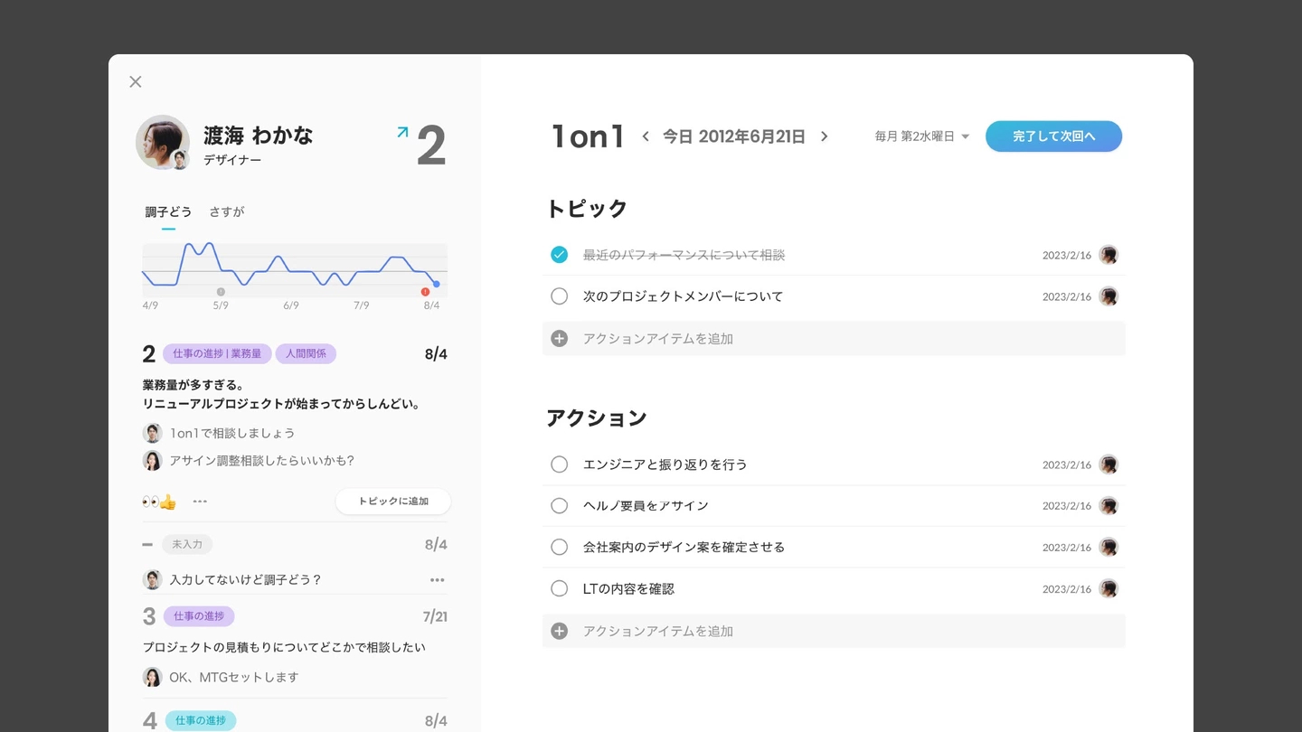 従来のコンディションマネジメントツールに加え、組織に解決可能な課題があることを実感してもらえるように、1on1機能を追加するなど、より社員一人ひとりにフォーカスした課題解決を行えるようPulseの体験設計を再設計し、それに伴いデザインも大きく変更を加えた。