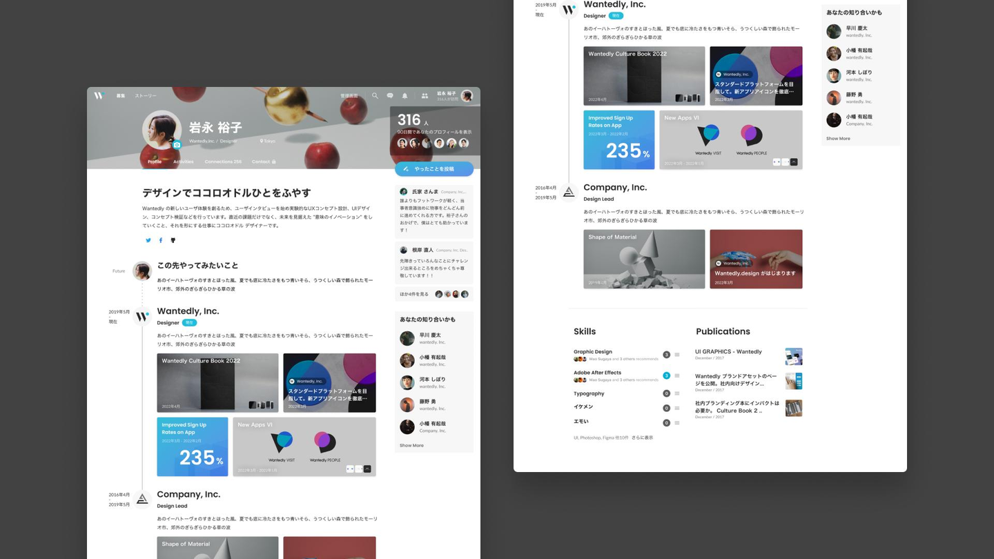 名刺交換やカジュアル面談など、つながった後もその人のアップデートをタイムリーに知り、交流を続けていくことが出来るようにプロフィールに記入した「やったこと」をタイムライン形式で見られるようデザインしました。 プロフィールと同様、コンテンツを見てつながりが「何をやったのか?」がひと目で分かるようにすること、経歴やプロフィール写真等の更新をわかりやすく魅力的にみえるような表現に挑戦しました。