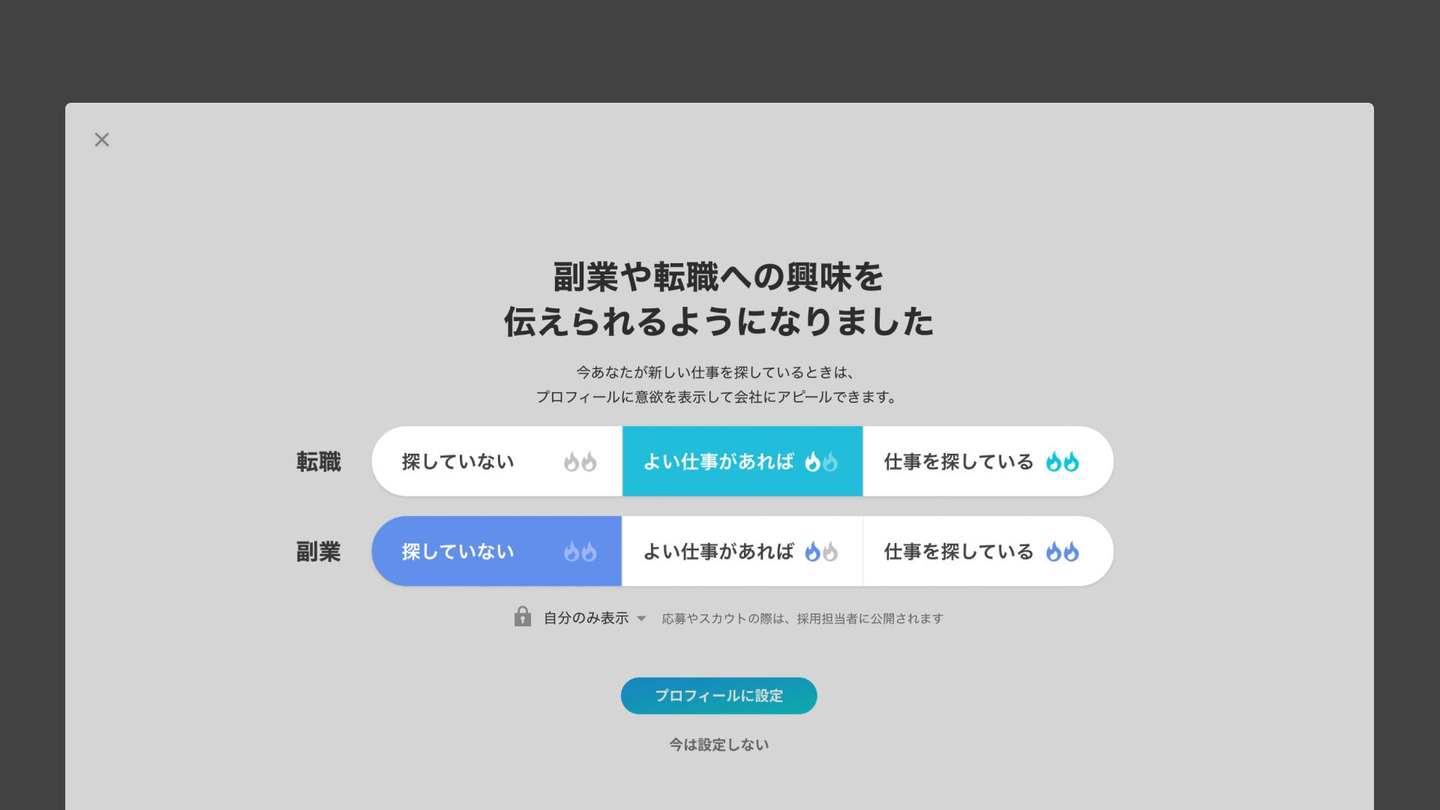 転職時期ではないユーザーや、ユーザーの目的を明確化することで、企業とのミスマッチを減らし、企業側の採用活動やユーザーの転職活動の効率を上げるためにリリース。 ユーザーへの入力訴求ではアンケートライクにワンクリックで意欲を選べるよう UIやライティングを考慮し入力率向上に貢献している。