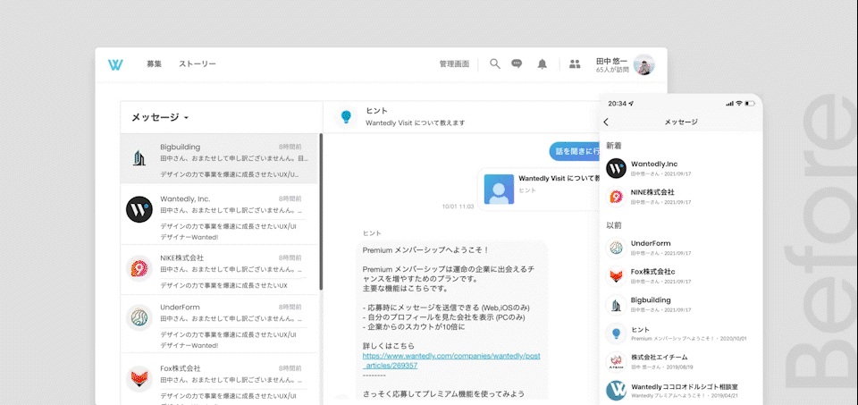 田中:当時「Wantedly VISIT」には、機能追加や改善を繰り返してきたことで情報が多くなり、統一感を欠いたUIによる操作負荷の増大という課題がありました。そこで、プロダクトを根本から刷新するためのリノベーションプロジェクトが立ち上がりました。