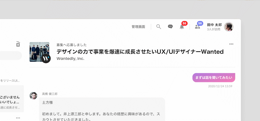5、6人のチームで分担しながら進めていたのですが、メッセージ画面については、コンセプト提案からデザインまで僕1人で担当しました。デザインをいまのトレンドに合ったものに刷新した上で、スクロールすることでスレッドタイトルが「募集名」から「企業名」に変わるインタラクションを設計し、“やりとりのはじまり”感の演出と使いやすさを両立しました。