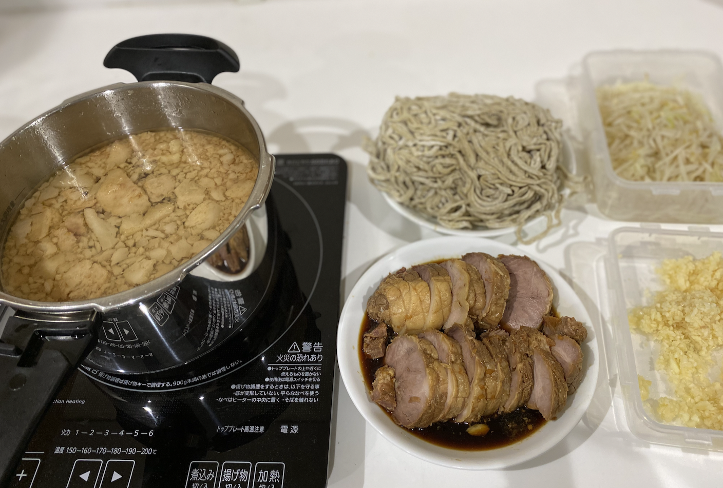 圧力鍋、タッパー2個、麺、チャーシューの総量は重いので2名で行きましょう。