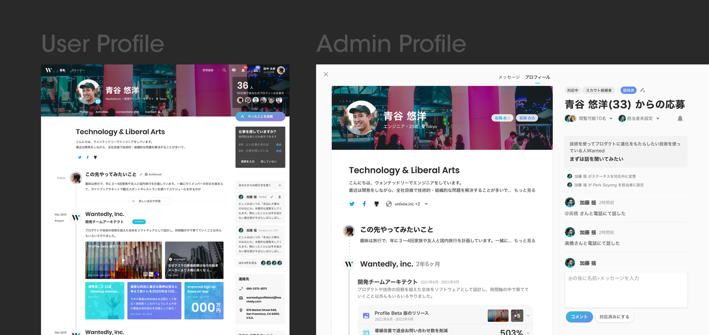 リニューアル前は、ユーザー側から見たプロフィール画面と企業側から見たプロフィール画面のユーザーインタフェースに一貫性がなかった。ユーザーが意図しない情報や見え方にならないようリニューアルした。 また企業側の体験として、スカウト候補者の情報にアクセスしづらいといった課題解決も並行して行なっている。