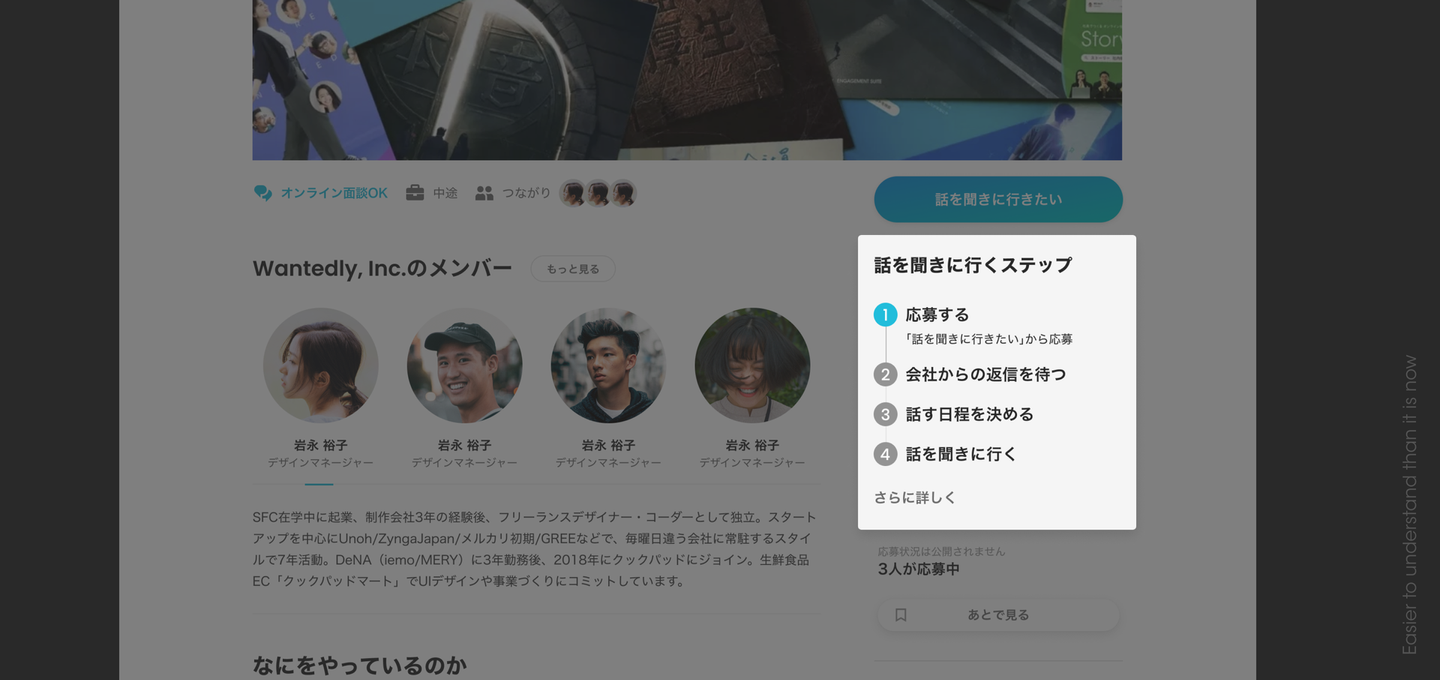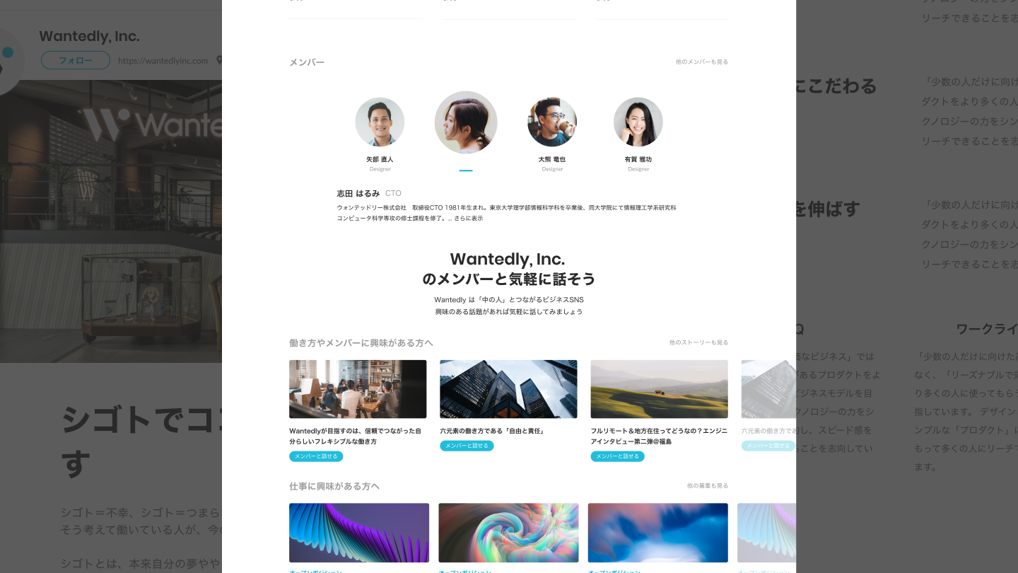 会社ページのメンバーセクションの下に、Wantedlyではメンバーと気軽に話せるサービスだとわかる訴求をすることで、サービスの認知や応募ハードルを下げるための施策です これにより、ログイン後の応募率が1.04倍増加した。(250~300/月増加)